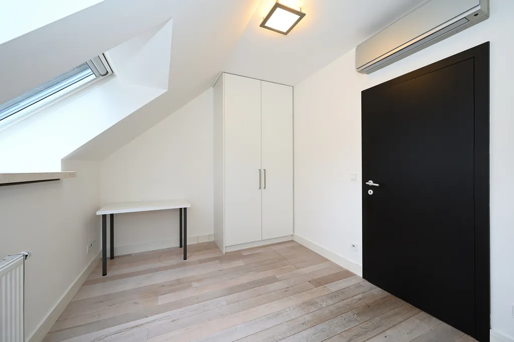 V horním patře bytu se nachází další dvě ložnice a koupelna se sprchovým koutem. Celkově tak byt disponuje čtyřmi ložnicemi, což z něj činí ideální volbu pro větší rodinu nebo pro ty, kteří pracují z domova a chtějí některý pokoj využít jako kancelář.