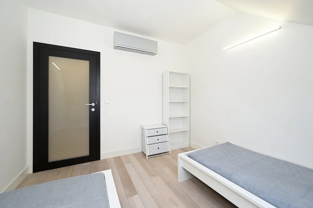 Každá obytná místnost v bytě, tedy všechny ložnice i obývací pokoj, je vybavena vlastní klimatizační jednotkou, takže máte vyřešen zásadní problém, kterým je horko během letních měsíců. V celém bytě jsou dřevěné podlahy, koupelny jsou provedeny v mramoru v matném provedení, a to jak na podlahách, tak na stěnách. Kuchyňská linka je vybavena kvalitními spotřebiči značky AEG, včetně myčky na nádobí, sklokeramické varné desky, elektrické trouby, digestoře a lednice s mrazákem.