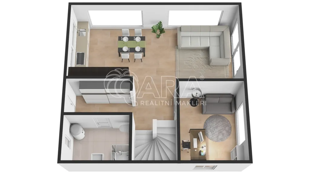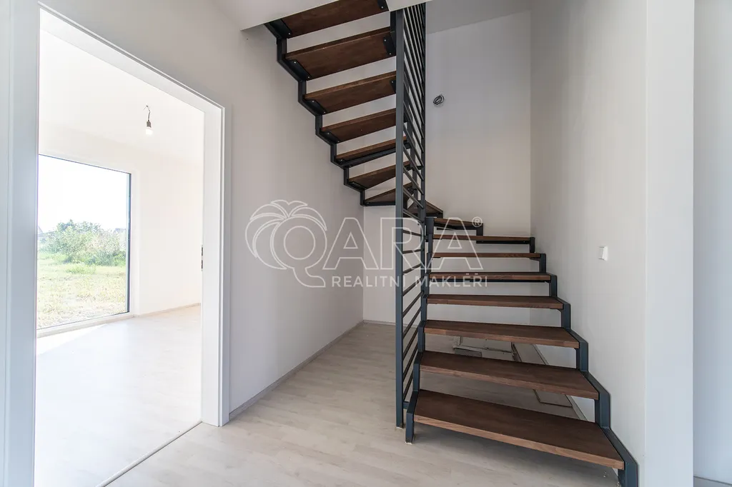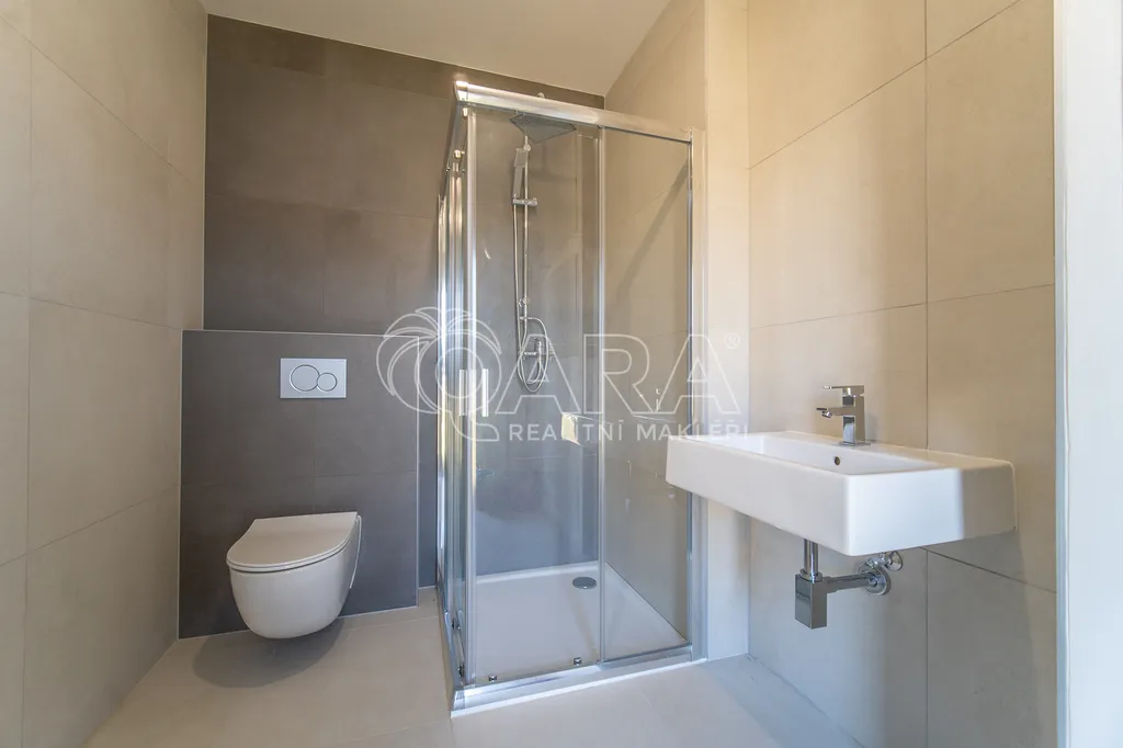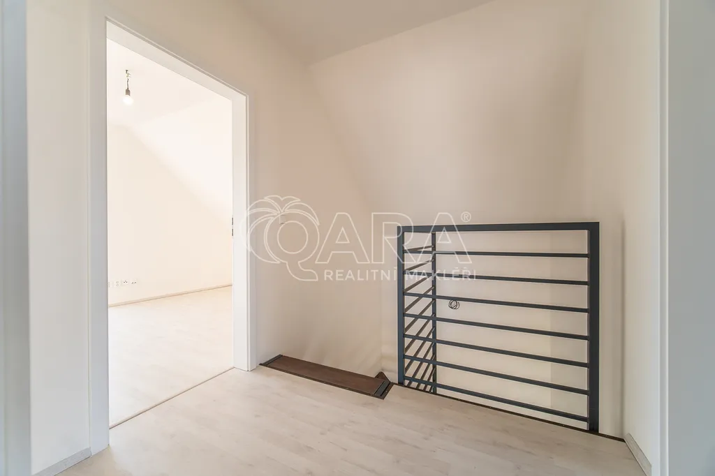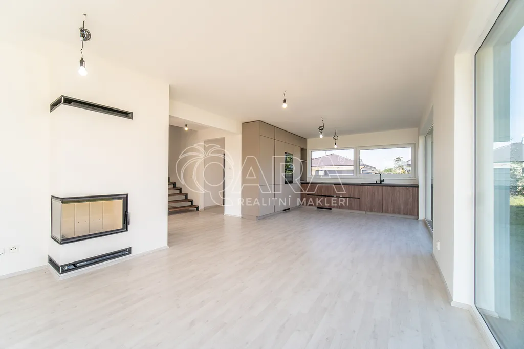 Po vstupu do domu vás přivítá vstupní hala, u které se nachází koupelna se sprchovým koutem, toaletou a technickým zázemím. Vstupní prostor je zařízen vestavěným nábytkem na míru, který ladí s designem kuchyňské linky. Chodbou se dostanete do prostorného obývacího pokoje (33 m²) propojeného s kuchyňským koutem, který je vybaven kvalitními spotřebiči Siemens. Dominantou této části je krb a přímý vstup na terasu. V přízemí se dále nachází jeden pokoj (12 m²), ideální jako pracovna či pokoj pro hosty, a schodiště do patra.