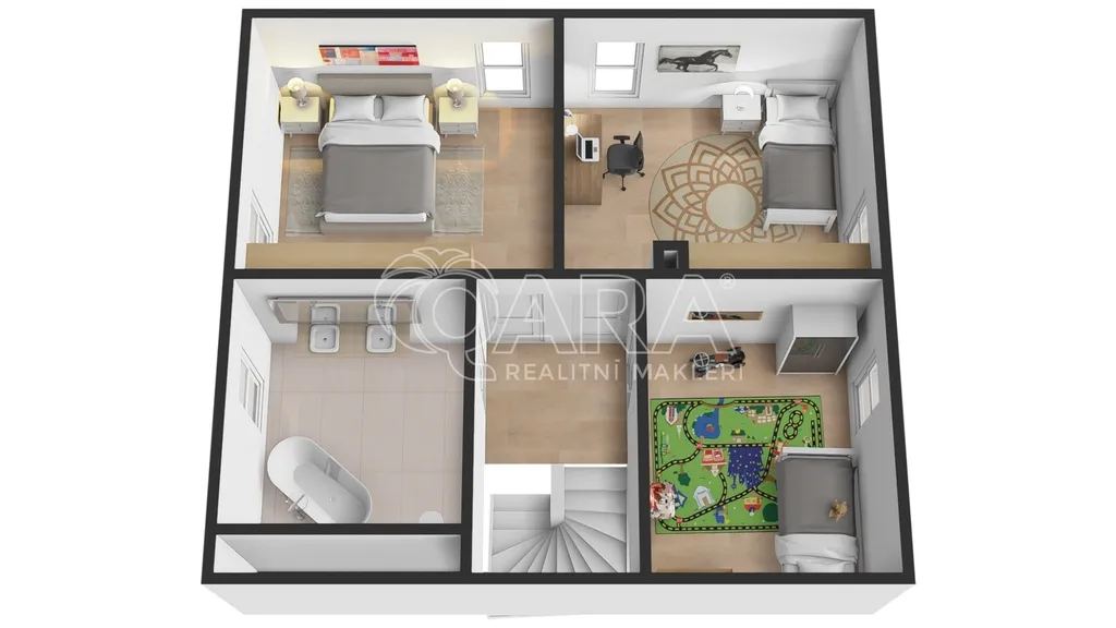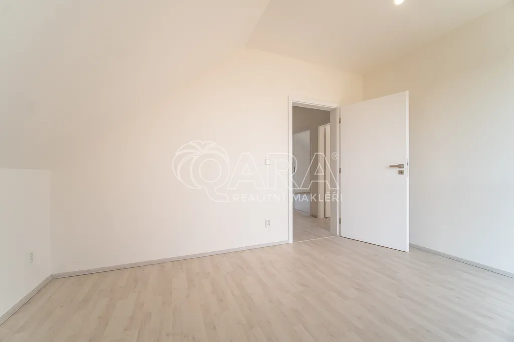 V horním patře jsou tři ložnice (16,73 m², 16,73 m² a 12,16 m²) a prostorná koupelna s vanou, dvojumyvadlem a toaletou.