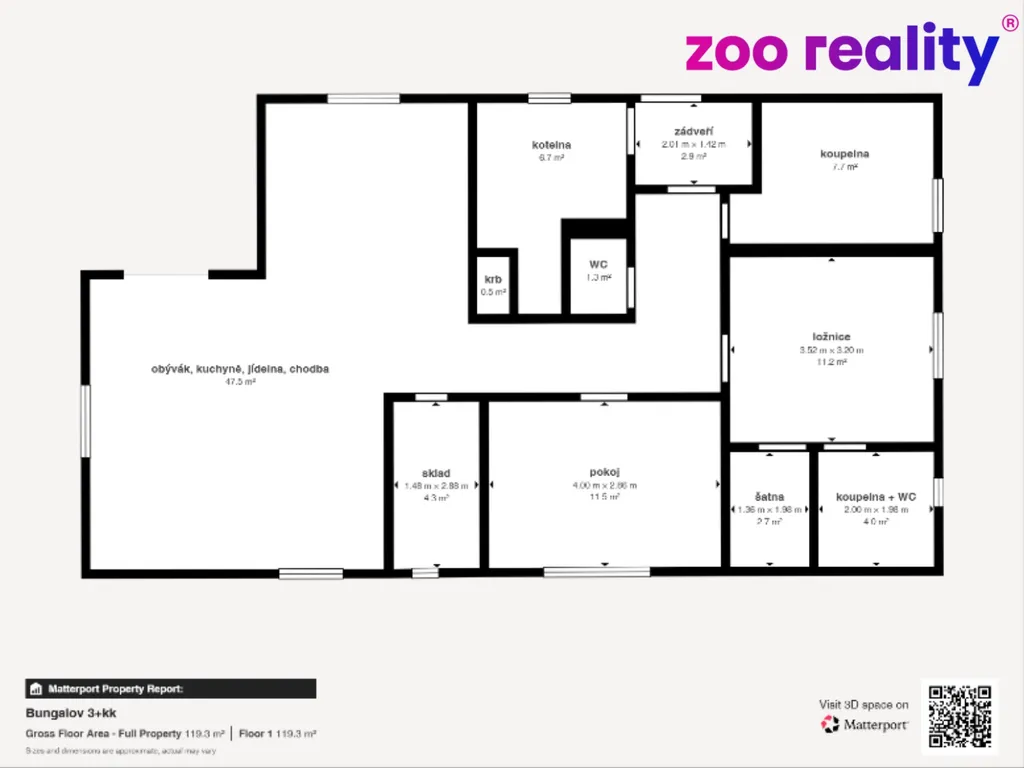Dům s užitnou plochou 120 m² o dispozici 3+kk zahrnuje prostorný obývací pokoj propojený s jídelním koutem a kuchyní. Dále pak ložnici, která nabízí i komfort navazující koupelny a šatny. Následně pokoj, koupelnu, samostatné WC, praktickou spíž a technickou místnost. K dispozici je i půda jakožto úložný prostor.