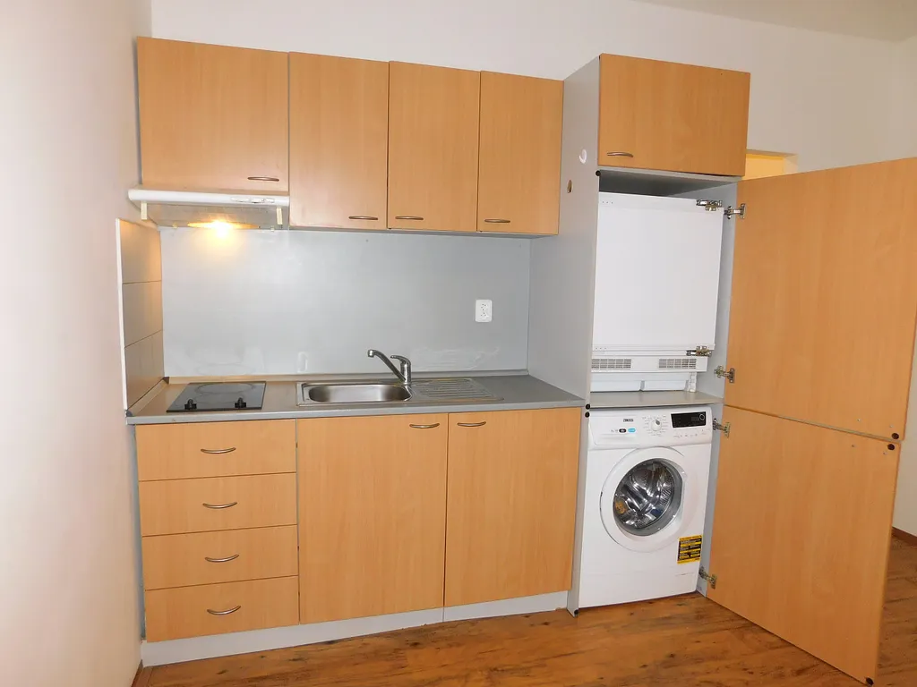 Byt je světlý, ve velmi dobrém stavu. V kuchyni se nachází kuch. linka, lednička, pračka a sklokeramická varná deska, v koupelně umyvadlová skříňka.