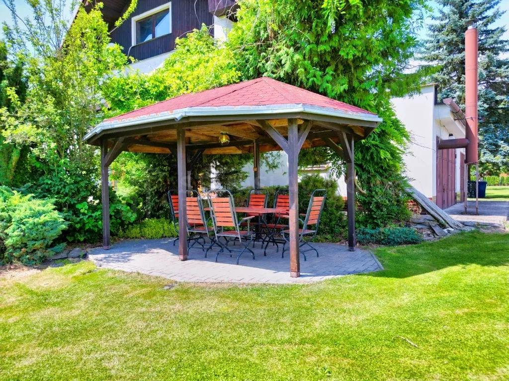 Nemovitost leží na rozlehlém pozemku o celkové výměře 7376 m² s vlastní příjezdovou cestou, který je udržován jako park, poskytující oázu klidu a soukromí pro relaxaci a trávení volného času. Na pozemku je k dispozici dvojgaráž, 3 krytá parkovací stání, pergola, zahradní chatka, skleník, kůlna na zahradní techniku aj. Sportovní nadšenci, upřednostňující pohybové aktivity, ocení také vlastní tenisový kurt nebo velký zastřešený bazén.