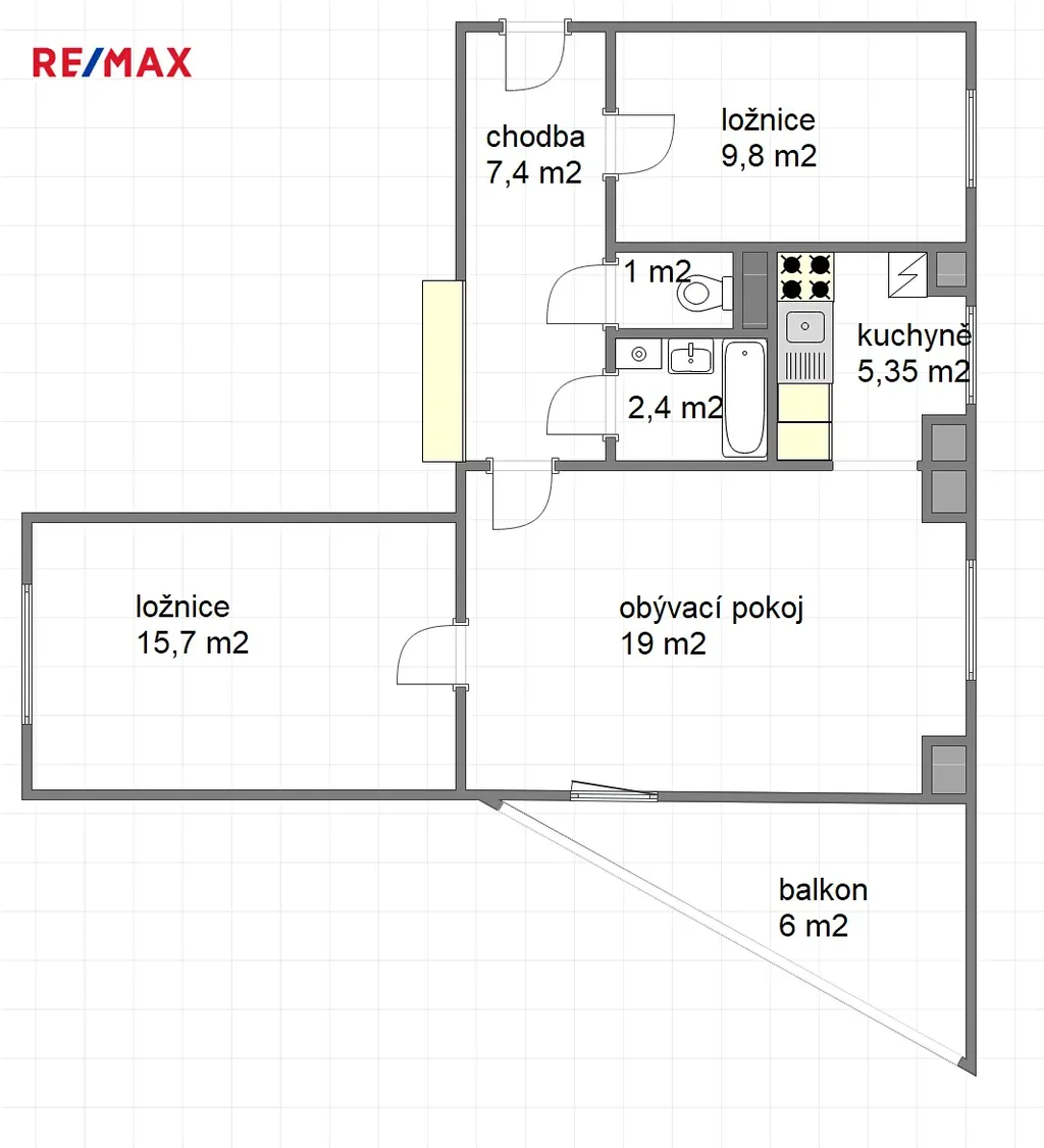 Nabízíme k prodeji příjemný byt 3+1 o celkové velikosti 69,7 m2 (z toho je 6 m2 balkon a 3 m2 sklepní kóje). Byt má k dispozici balkon orientovaný do zahrádky u domu, nachází se na třetím podlaží cihlového domu s výtahem. Byt je šikovně rozložen, ve vstupní chodbě jsou vestavěné úložné skříně, vstup do ložnice (9,8 m2), koupelny s vanou a WC zvlášť a dveře do obývacího pokoje (19,25 m2). Z obývacího pokoje lze vstoupit na trojúhelníkový balkon (6 m2), do kuchyňky a do další ložnice (15,7 m2). Okna vedou na JV (ložnice), SZ (obývák, kuchyně a ložnice) , balkon je orientován na SV. V pokojích jsou na podlaze původní dřevěné parkety, ostatní plochy jsou kryté dlažbou či linem. V bytě je zaveden plyn (sporák), topení a teplá voda je řešena centrálně, z výměníku vedle domu. K dispozici je sklepní koje v suterénu domu. Pro obyvatele domu je možné využít i společné sušárny, mandl či kočárkárnu.