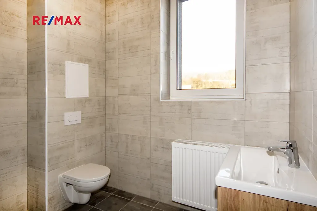 Moderně postavený dům je vytápěn pomocí tepelného čerpadla, rozvod tepla i teplé vody je ústřední.