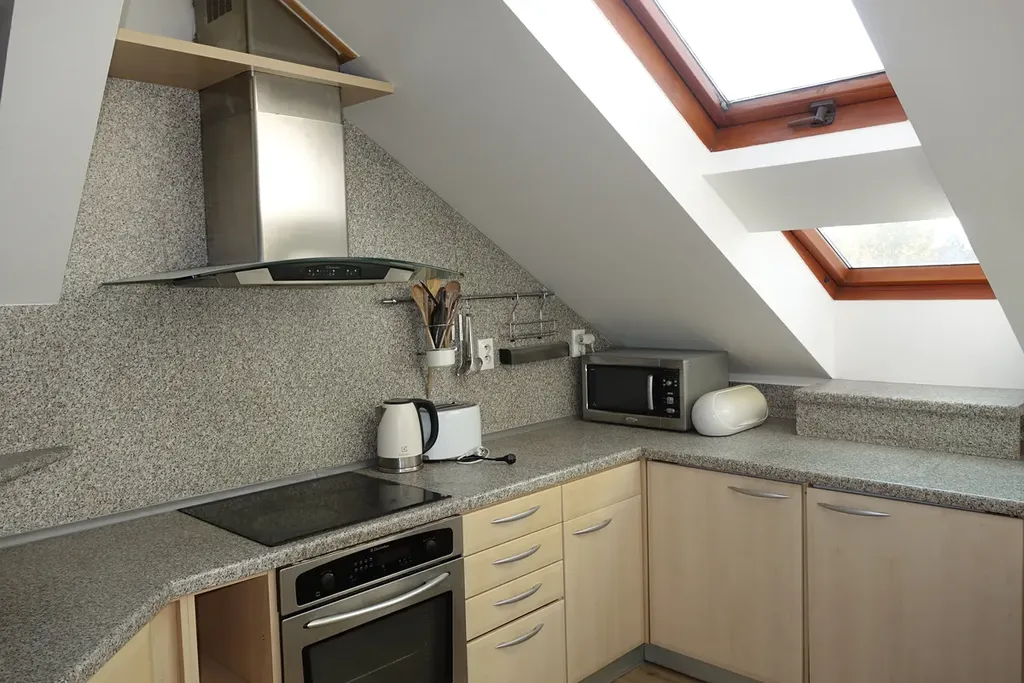 Kuchyňská linka je plně vybavena spotřebiči – elektrickou troubou, sklokeramickou varnou deskou, digestoří, myčkou nádobí, lednicí, mrazničkou i mikrovlnnou troubou. Byt je částečně zařízen nábytkem, který lze po dohodě vyklidit. Samozřejmostí je centrální vytápění, ohřev vody a internetové připojení. Nájemníci mohou navíc využívat klidný dvůr se zahradou.