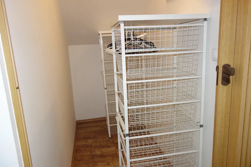 K dispozici je koupelna s vanou a sprchovým koutem, samostatné WC, šatna, spíž a praktické úložné prostory v podkroví. Výměry místností jsou orientační.