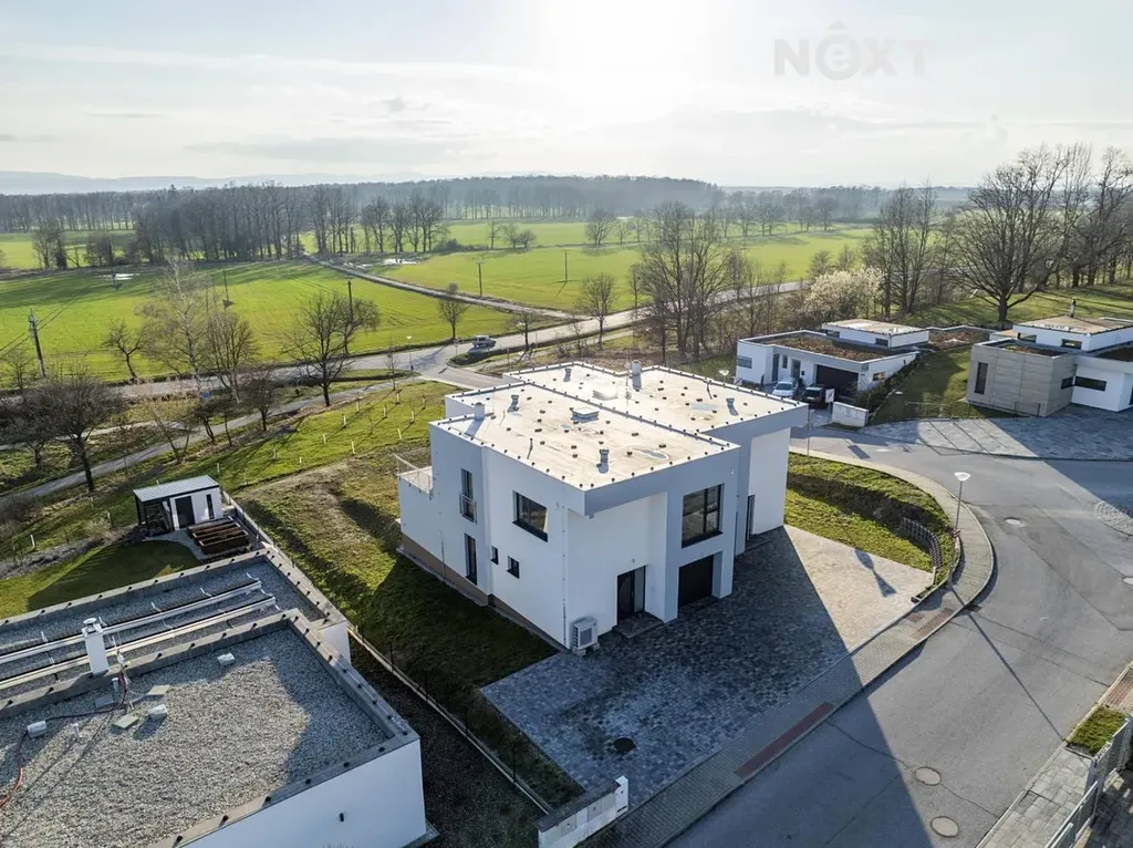 Dominantou bytové jednotky je velkorysý obytný prostor s kuchyní o celkové rozloze 56 m². Díky velkoformátovým proskleným plochám a přímému vstupu na venkovní terasu o výměře 21 m² vzniká přirozené propojení interiéru s exteriérem. Jihozápadní orientace přináší dostatek slunečního světla, klid a otevřené výhledy do okolní přírody. Horní podlaží je koncipováno jako soukromá klidová zóna. Hlavní ložnice o rozloze 24,7 m² disponuje vlastní šatnou (7,1 m²) a vstupem na terasu s výhledem do okolní krajiny. Dva další pokoje o velikostech 21,9 m² a 17,4 m² poskytují dostatek prostoru pro rodinu, děti či pracovnu. Samostatná šatna o rozloze 7,6 m² zajišťuje nadstandardní úložné možnosti a luxusní koupelna s vanou, sprchovým koutem a toaletou (9,8 m²) splňuje vysoké nároky na komfort bydlení. Jednotlivé místnosti propojuje hala o velikosti 24,8 m², jejímž architektonickým prvkem je masivní dubové schodiště, které podtrhuje nadčasový charakter interiéru.