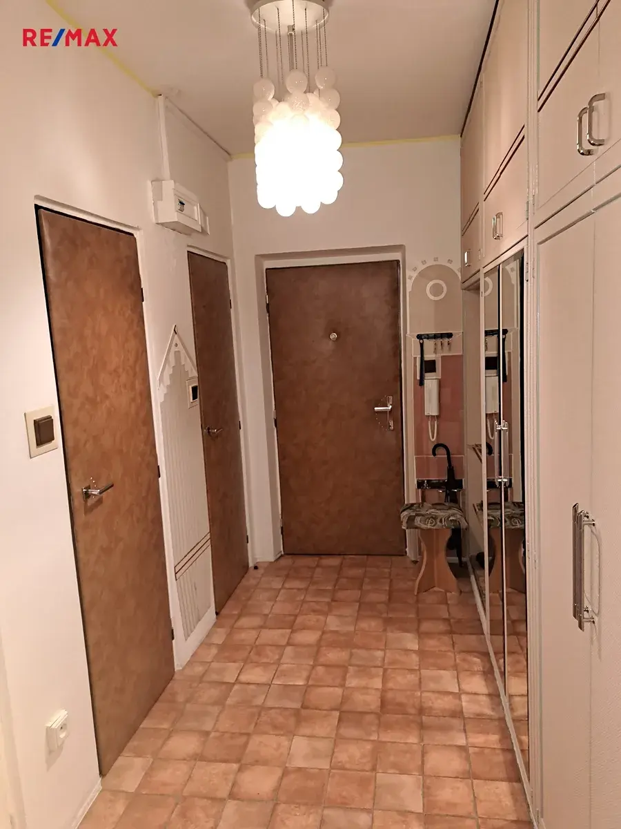 Byt sestává z předsíně, kuchyně, ložnice, obývacího pokoje, toalety a samostatné koupelny s vanou. Z obývacího pokoje je vstup na zasklenou lodžii o ploše 3 m2. V pokojích na podlahách parkety, v ostatních místnostech lino. V předsíni jsou prostorné vestavěné skříně. K bytu náleží sklep. Dálkové dodávky tepla a teplé vody.
