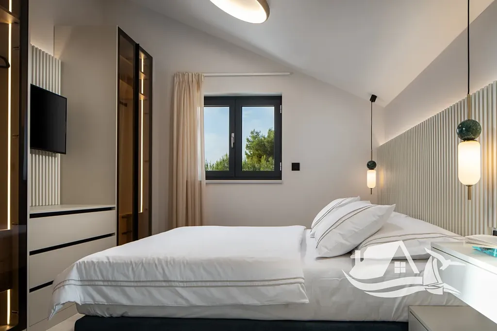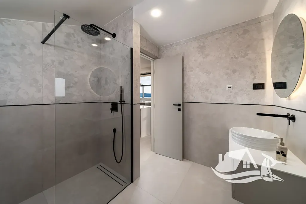 První patro nabízí tři samostatné ložnice, každou s vlastní koupelnou a lodžií, což zajišťuje maximální soukromí pro všechny obyvatele i hosty. Z terasy se otevírá krásný výhled na moře, který podtrhuje výjimečný charakter celé nemovitosti a zvyšuje její dlouhodobou hodnotu.