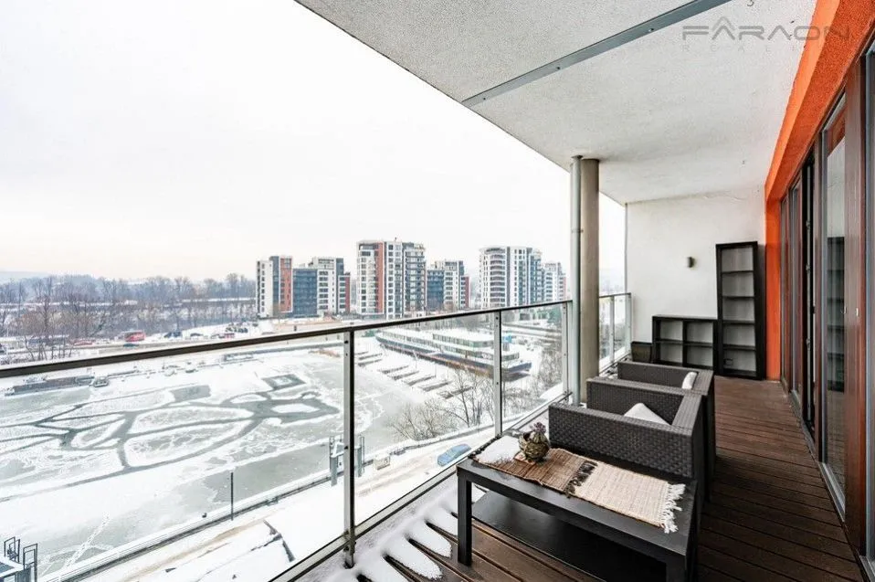 Pronájem kompletně vybaveného, prostorného bytu 2+kk (69,8m2) s terasou a okouzlujícími výhledy na Vltavu a přilehlé okolí plné zeleně umístěného v 7.podlaží moderního, velmi oblíbeného rezidenčního komplexu 24h recepcí, ostrahou, kamerovým systémem s parkovacím místem a sklepem v ceně nájmu. Mimořádně atraktivní a žádaná lokalita v příjemném prostředí na holešovickém poloostrově, u Vltavy, v turbulentně se rozvíjející části Praha 7 - Holešovice s rychlým spojením do centra a kompletní občanskou vybaveností v pěším dosahu.