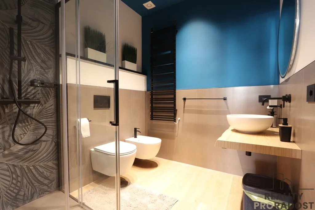 Z chodby se vstupuje do prosvětlené ložnice, která zahrnuje komfortní dvoulůžkovou ložnici a koupelnu se sprchovým koutem a oknem, jež zajišťuje přirozené osvětlení i odvětrávání. Praktická šatna nabízí další úložný prostor pro předměty denní potřeby.