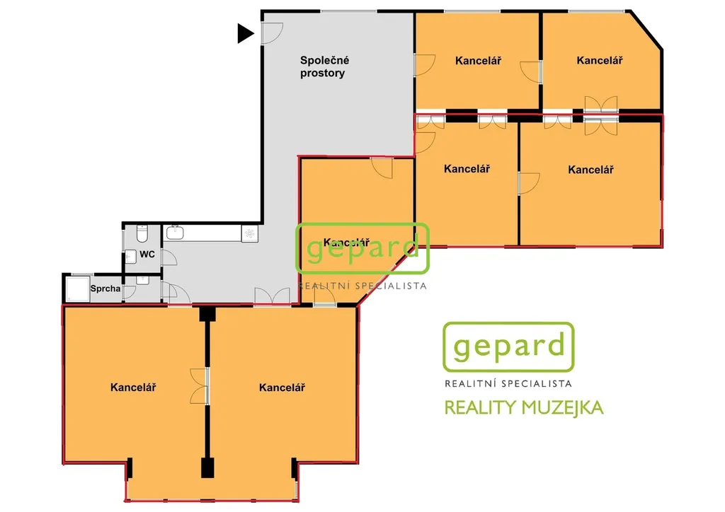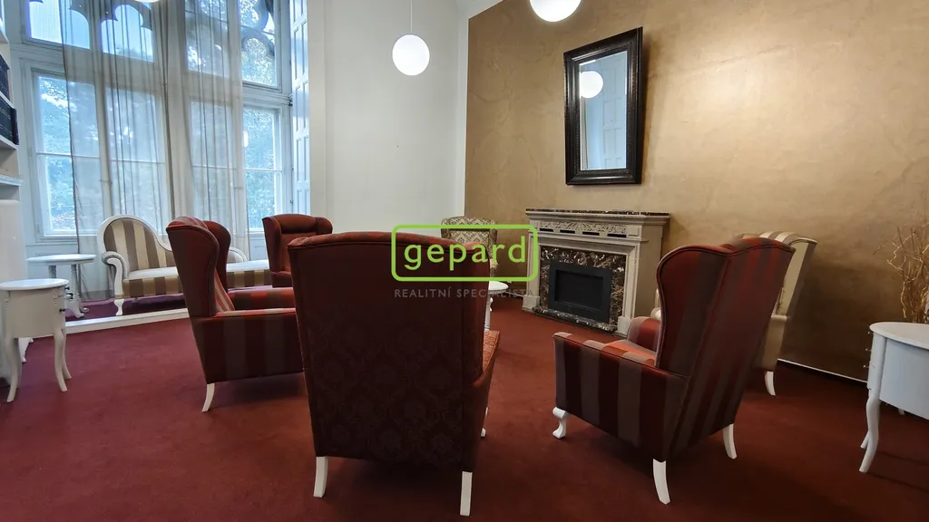 Jedná se o pět vzájemně propojených kanceláří v 1.patře, celkem 126 m2. Aktuálně jsou všechny místnosti vybaveny nábytkem. V jedné z místností je lihový krb, dvě místnosti jsou obloženy dřevem v anglickém stylu. Společně s nimi se užívá zázemí na patře, určené i pro další nájemce - společná vstupní místnost, vybavený kuchyňský kout, toaleta a koupelna se sprchou.
