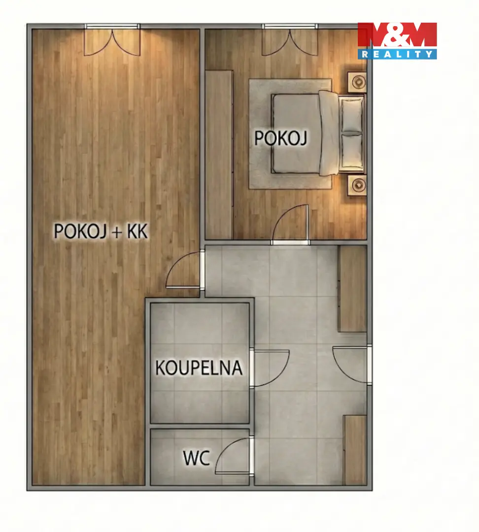 Samostatná ložnice o ploše cca 13 m², která zajišťuje dostatek soukromí, není z důvodu zachování osobního prostoru majitelů fotograficky prezentována.