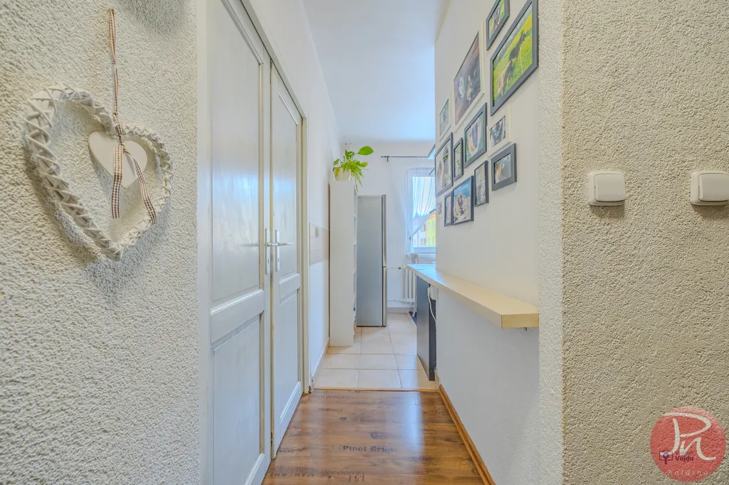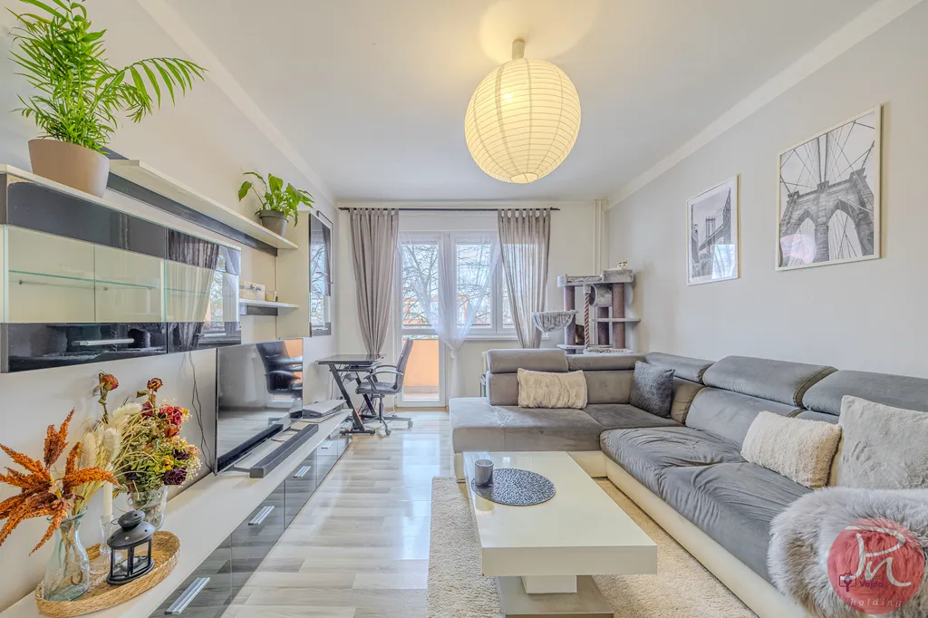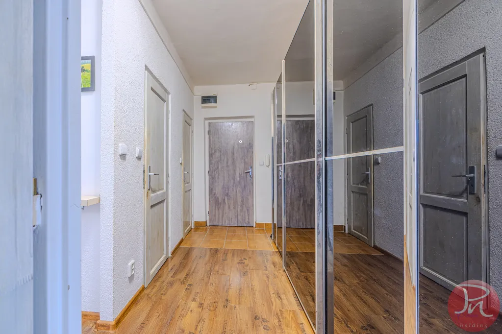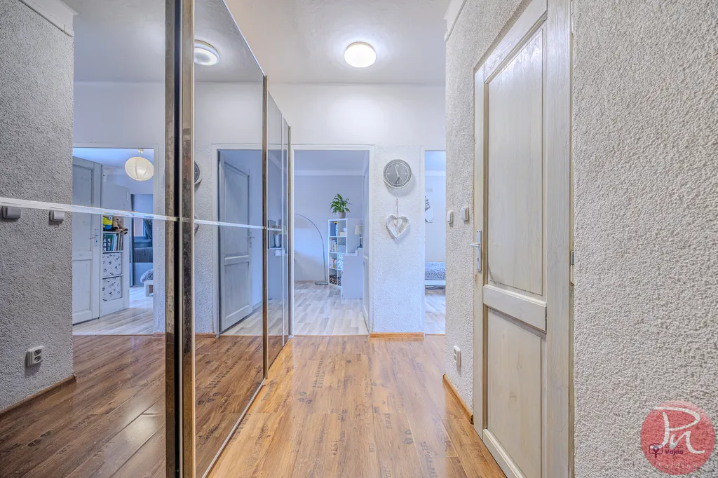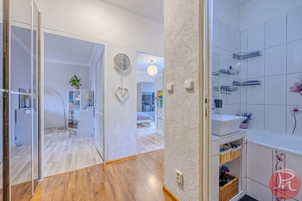 Byt má praktickou dispozici se dvěma samostatnými pokoji, oddělenou kuchyní, koupelnou s vanou, samostatnou toaletou a prostornou vstupní chodbou s dostatkem místa pro úložné řešení. Díky svému uspořádání je byt světlý, vzdušný a působí velmi příjemným dojmem.