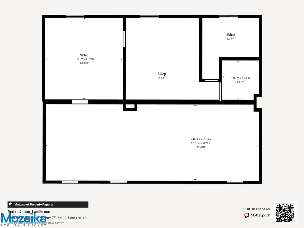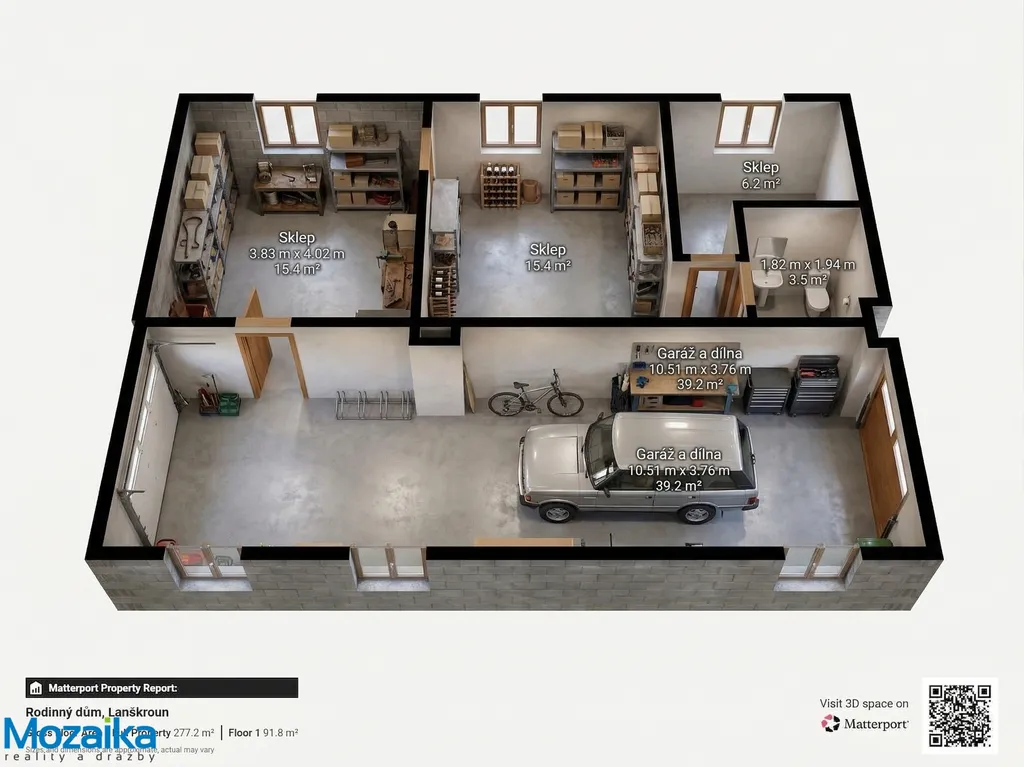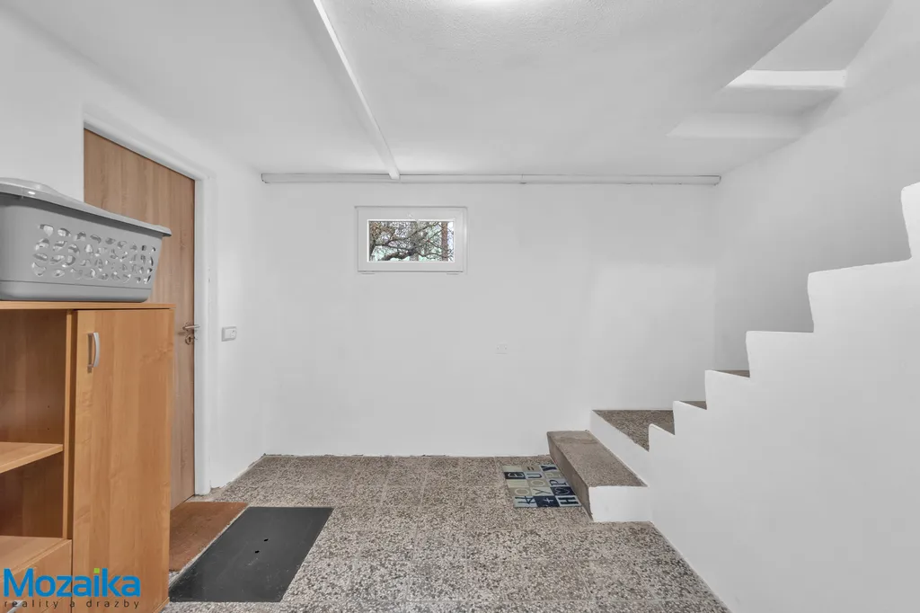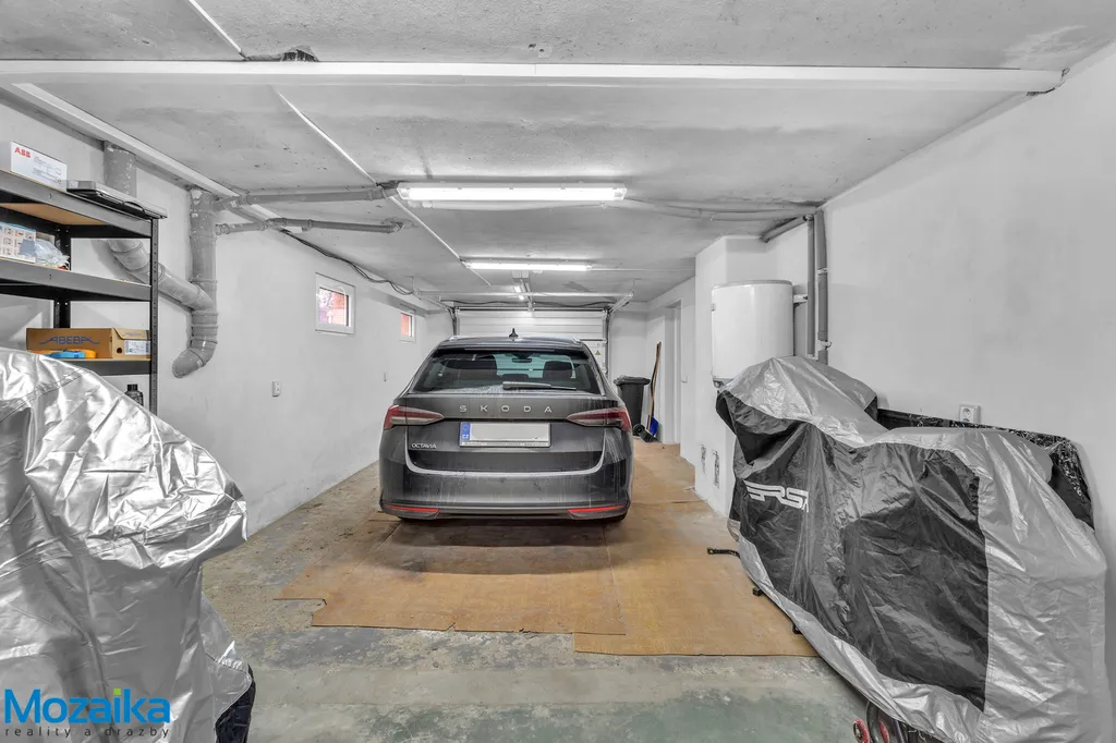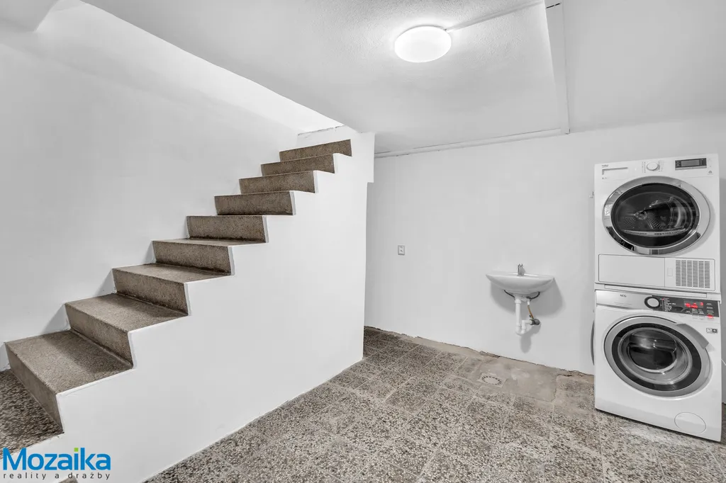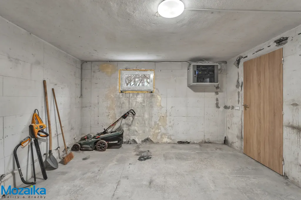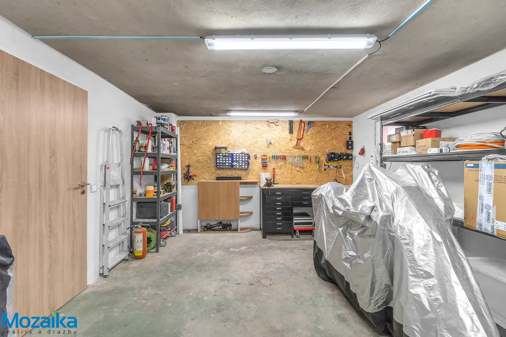 Suterén nabízí garáž s dílnou, prádelnu a tři další místnosti využitelné podle vašich potřeb – ať už jako sklady, hobby místnosti či domácí posilovnu.
