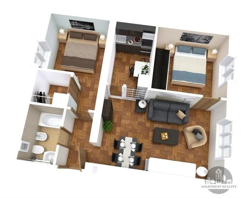 Nabízíme byt 3+1, který se skládá se ze vstupní chodby, obývacího pokoje, kuchyně, 2 ložnic, šatny a koupelny se vanou, WC a bidetem.