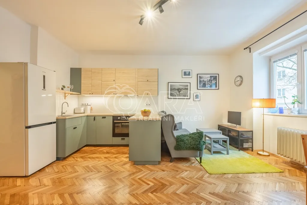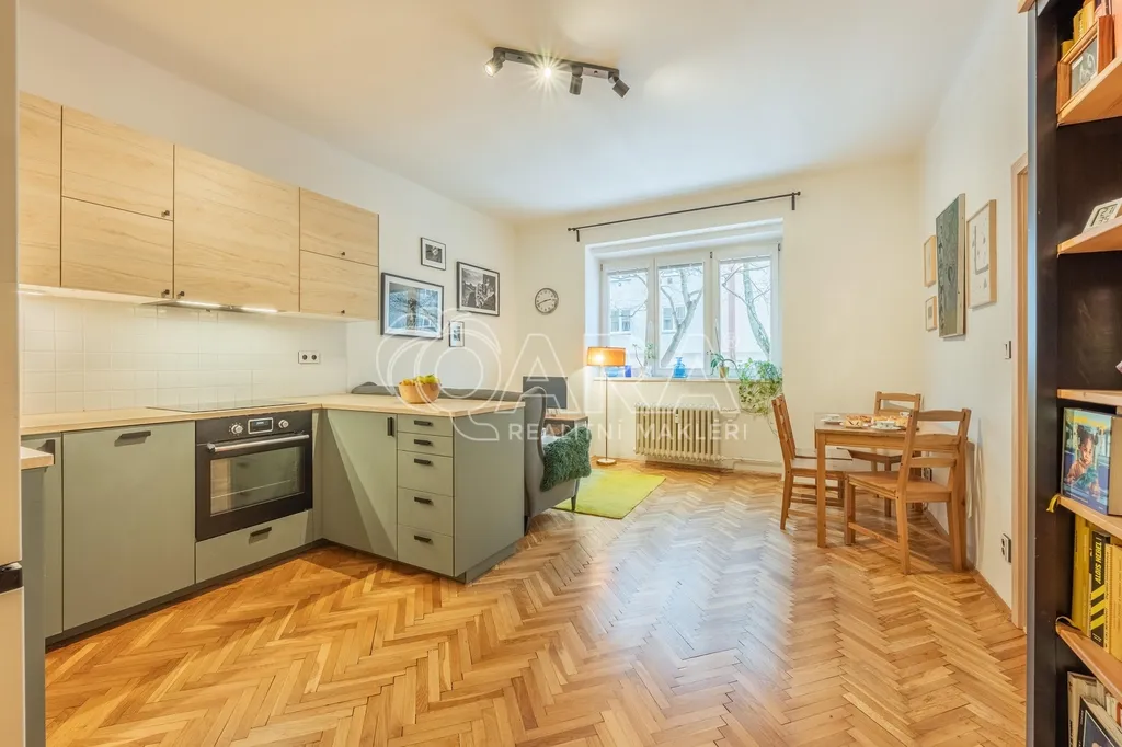 Byt prošel téměř kompletní rekonstrukcí – nové jsou zde elektroinstalace, broušené parkety, nová podlaha v chodbě, povrchy zdí jsou kompletně přeštukované. Kuchyňská linka je přibližně 5 let stará a je součástí prostorného obývacího pokoje. Koupelna s WC je v původním, ale plně funkčním stavu.