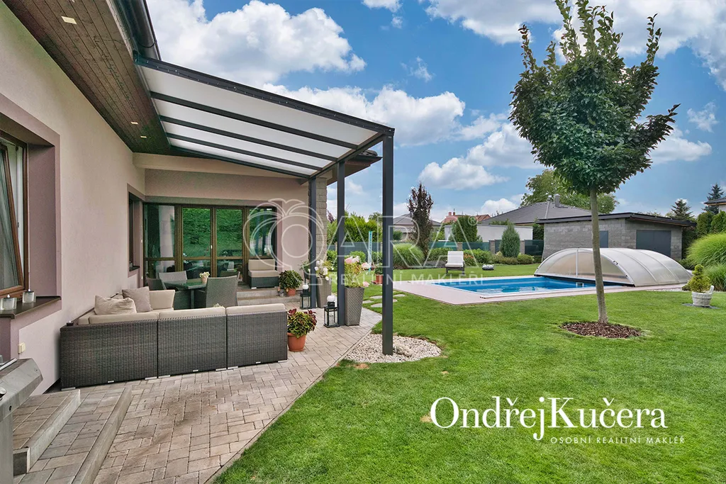 Zahrada kolem domu byla promyšleně navržena architektem, aby se během roku měnila v pestrou podívanou. Automatický zavlažovací systém napojený na vlastní vrt a retenční nádrž zajišťuje její nenáročnou údržbu. Je zde také zapuštěný keramický bazén se slanou vodou a samostatný zahradní domek s dílnou. Součástí prodeje je i automatická sekačka.