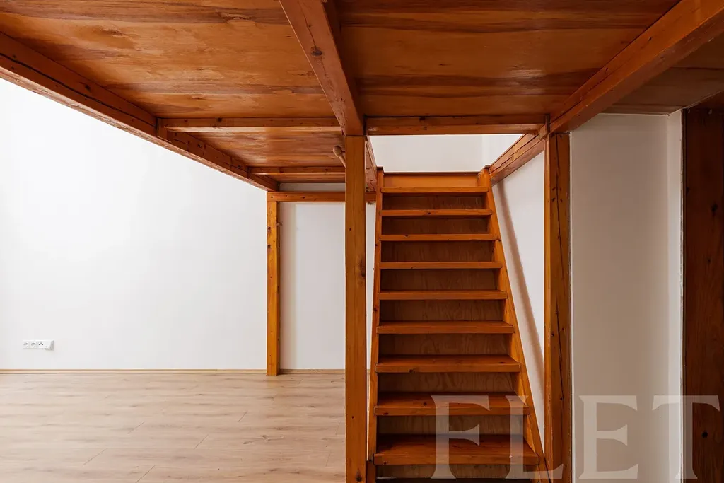 Byt se skládá z hlavní prostorné místnosti, kde je pro vás připraveno řemeslně zpracované vestavěné patro a je zde také dostatek prostoru pro gauč i pracovní stůl, a velké chodby s kuchyňským koutem. Tento kuchyňský prostor plynule navazuje na předsíň a je zařízen troubou se sporákem a také lednicí. V koupelně se sprchovým koutem a toaletou je k dispozici také pračka.
