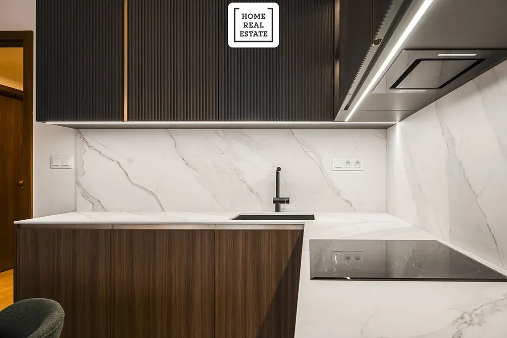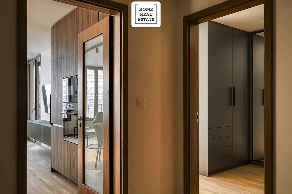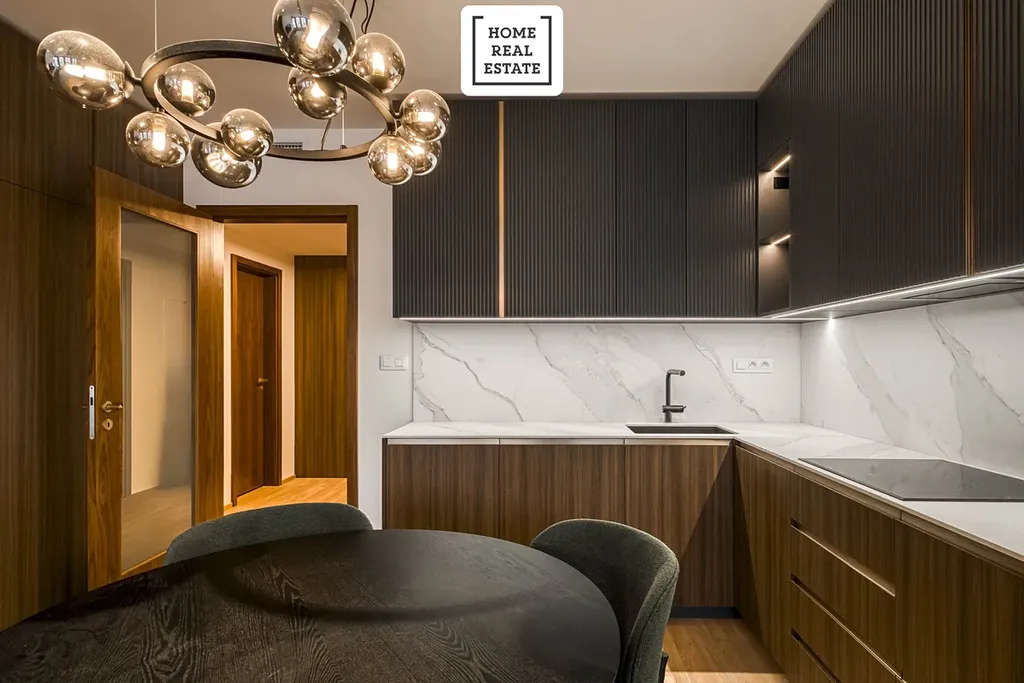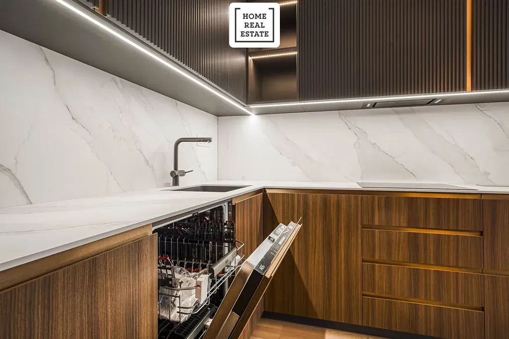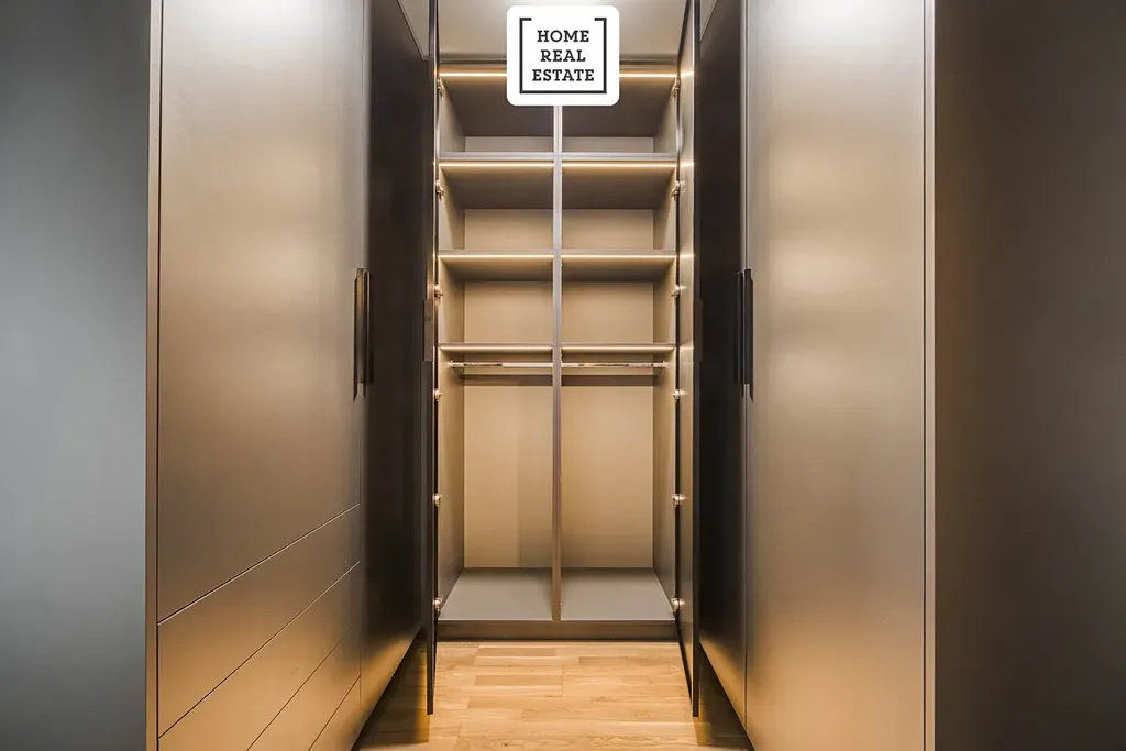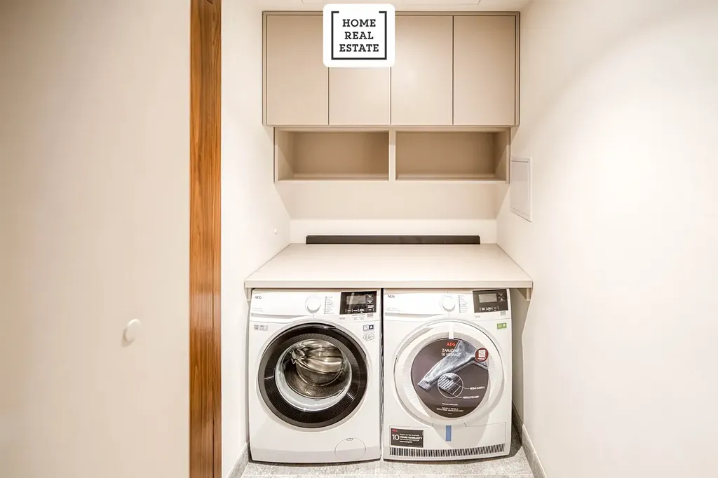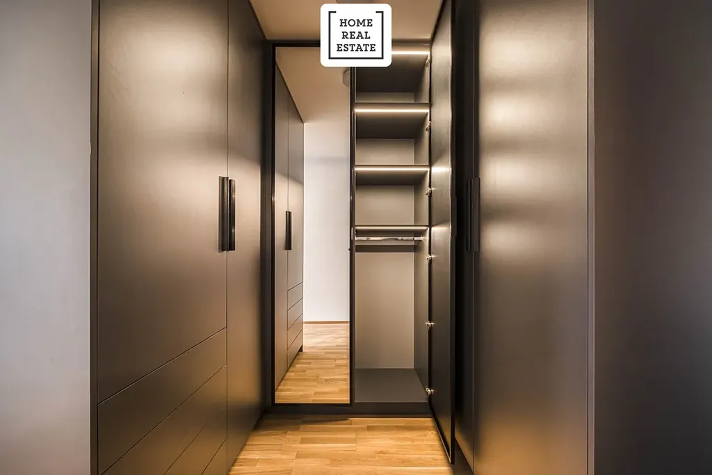 Vybavení bytu bylo zařízené kompletně na míru. Určitě pokud jste milovníci vaření, tak oceníte velkou kuchyň obsahující vše nezbytné a zároveň nadstandardní. Je k dispozici pro budoucího nájemce velké množství vestavěných skříní, velká šatna v ložnici a oddělená prádelna, která obsahuje též vestavěné skříně s pračkou a sušičkou.