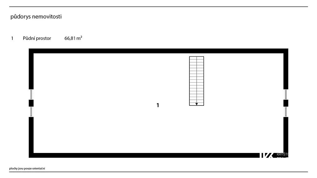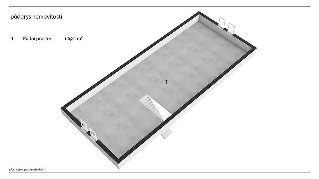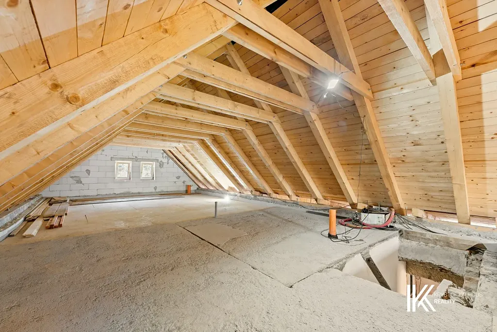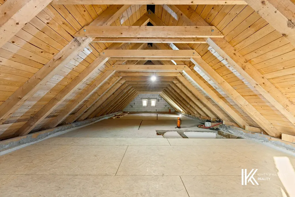 Podkroví o ploše cca 67 m² je otevřeným prostorem s možností vytvoření druhé koupelny, na kterou je zde příprava, a dvou či více ložnic, případně jiného uspořádání dle potřeb nového majitele.