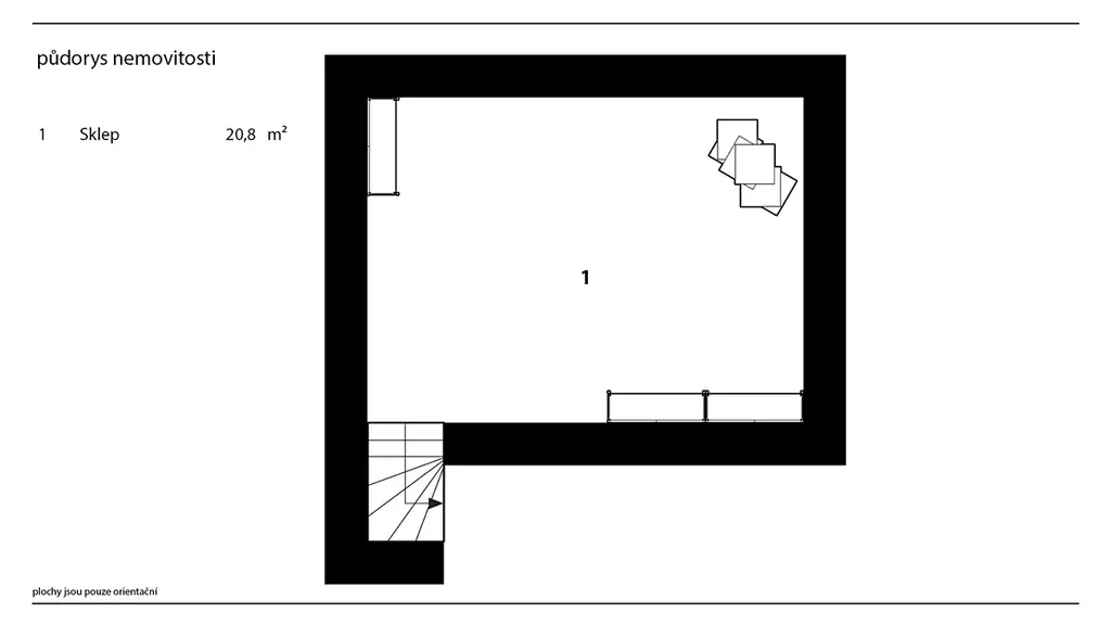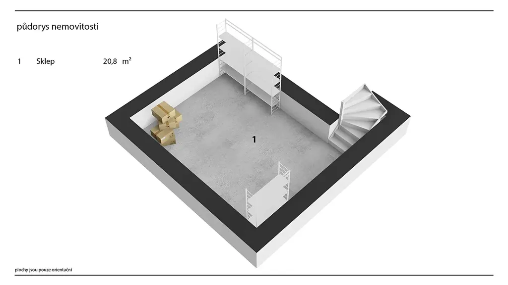 Přízemí nabízí tři místnosti, z čehož největší je budoucí obývací pokoj o velikosti téměř 29 m², dále samostatná kuchyně cca 9 m² a pokoj o velikosti 21 m² vhodný jako ložnice, pracovna nebo pokoj pro hosty.