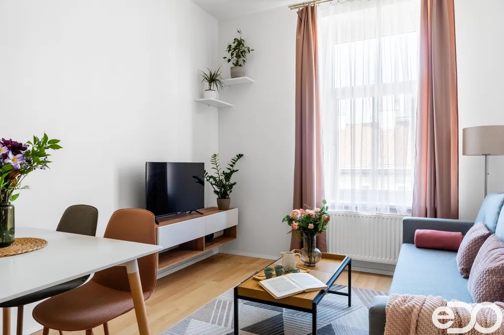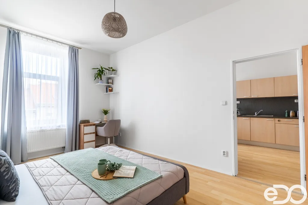 Byt je v dobrém stavu, s novými rozvody a podlahami starými přibližně 10 let. Vytápění i ohřev vody zajišťuje vlastní domovní kotelna (dokončení rekonstrukce domu v roce 2025). Dispozici tvoří obývací pokoj s kuchyňským koutem (bez myčky), ložnice, koupelna se sprchovým koutem a WC. Optický kabel je již doveden na chodbu. Výměry v tomto inzerátu jsou orientační.
