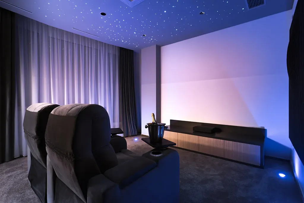 Tento byt je vytvořen pro nevšední život, proto v něm nechybí ani vlastní odhlučněné kino s komfortními křesílky, hvězdným nebem a speciálními rozvody připravenými pro zapojení profesionálního ozvučení.
