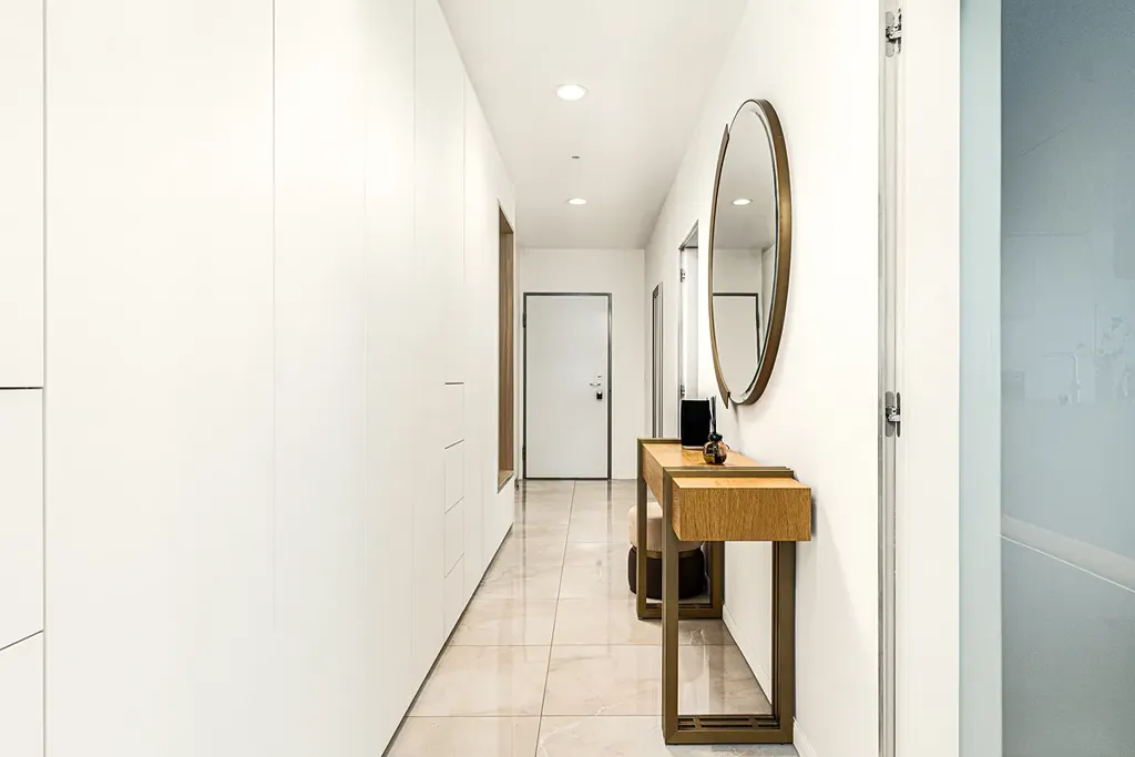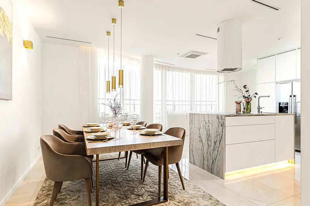 Příjemné chvíle s rodinou nebo přáteli si budete užívat v prostorném, luxusně vybaveném obývacím pokoji o velikosti 45 m², který je orientován na jih. Moderní žulový krb a kožená sedací souprava od ikonické italské značky Natuzzi. Dokonalou atmosféru doplňuje klimatizace, rekuperace a podlahové vytápění v celém bytě.