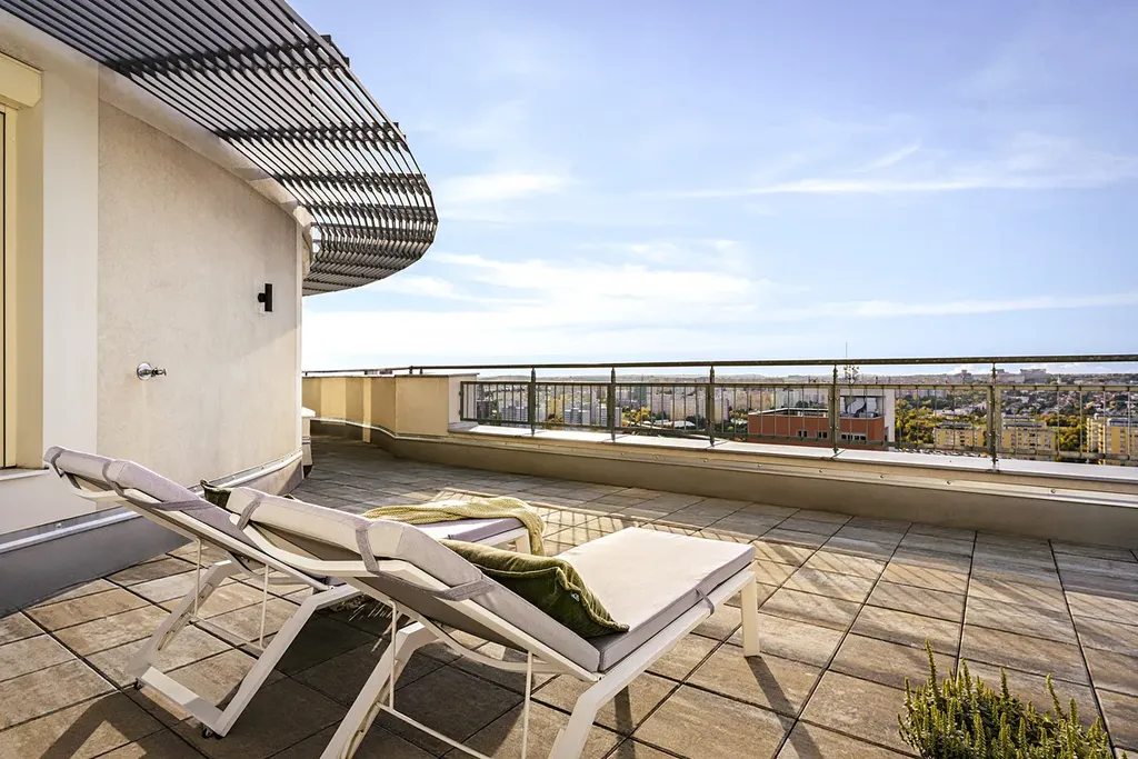 Tento luxusní střešní byt o výměře 228 m² se nachází ve 21. patře, které je tvořeno výhradně touto jednotkou. Má jedinečné dispozice 4+1 s prostornou halou a dvěma koupelnami. Disponuje také rozlehlou terasou o výměře 278 m², přístupnou z každého pokoje, vlastní kino místností a spa. Celý byt můžete dálkově řídit přes telefon odkudkoliv na světě díky inteligentní technologii Loxone.