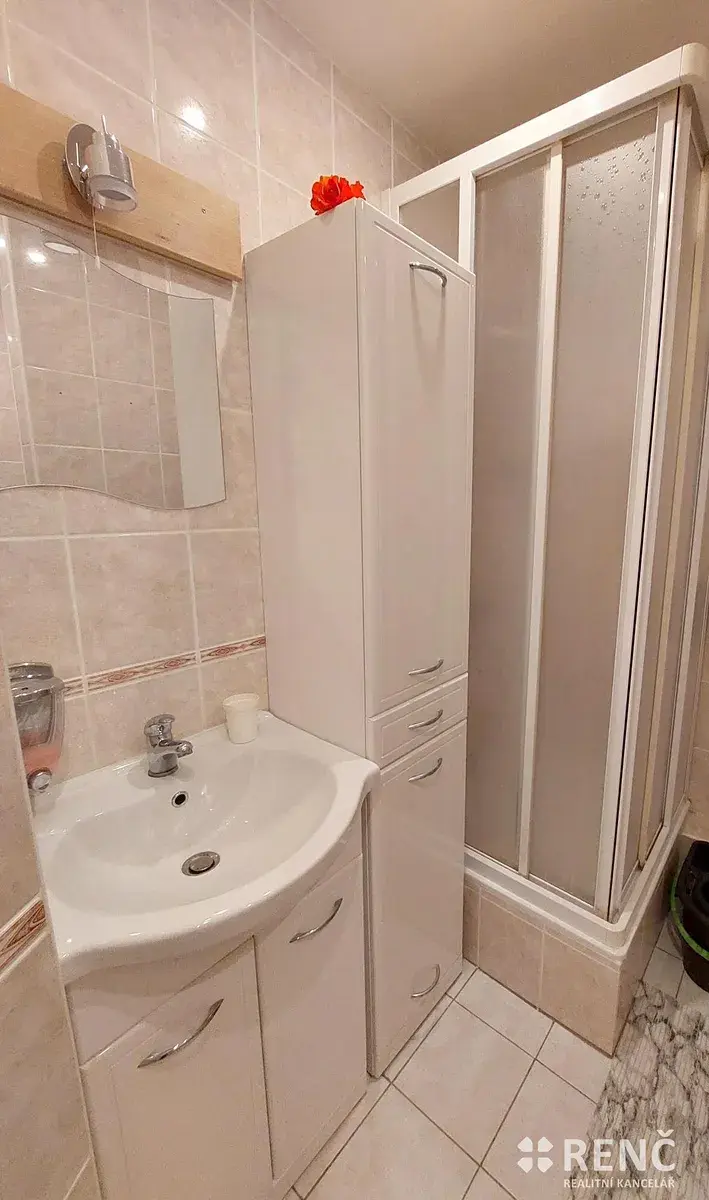 Koupelna se sprchovým koutem je společná s toaletou. V koupelně je instalována pračka.