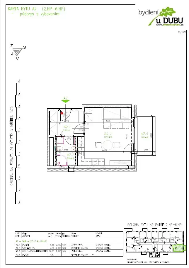 Bytová jednotka se nachází v 2. NP, disponuje zádveřím (5,66m2), koupelnou se sprchovým koutem a WC (3,86m2), obývacím pokojem s jídelnou a kuchyní (20,65m2) a balkónem (4,80m2).