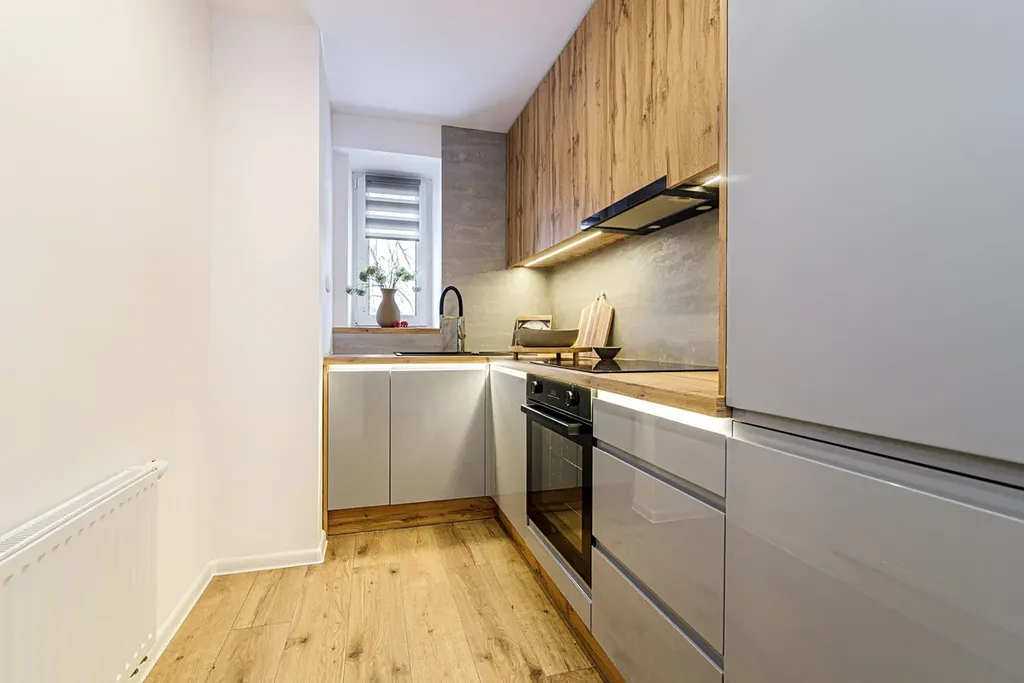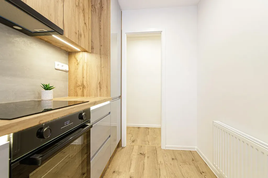 V kuchyni je nová rohová kuchyňská linka v kombinaci šedé barvy a dekoru dřeva s vestavěnými spotřebiči indukční varná deska, elektrická trouba, digestoř, plně integrovaná myčka, lednice s mrazákem.