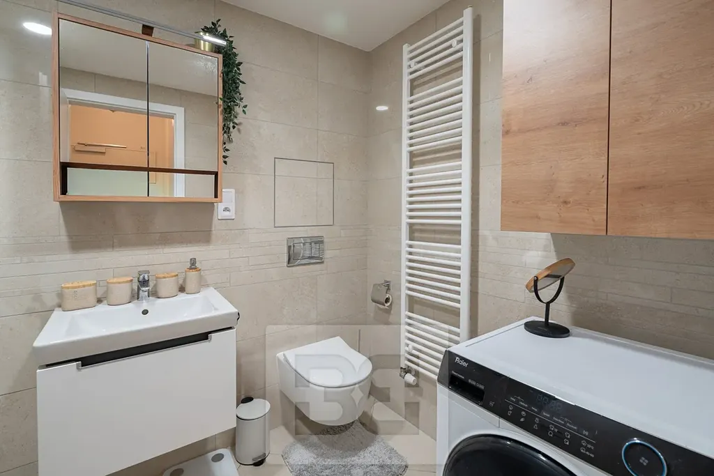• plně vybavenou kuchyňskou linku se spotřebiči Whirlpool a Electrolux (Lednice, myčka, trouba, indukční deska, mikrovlná trouba)