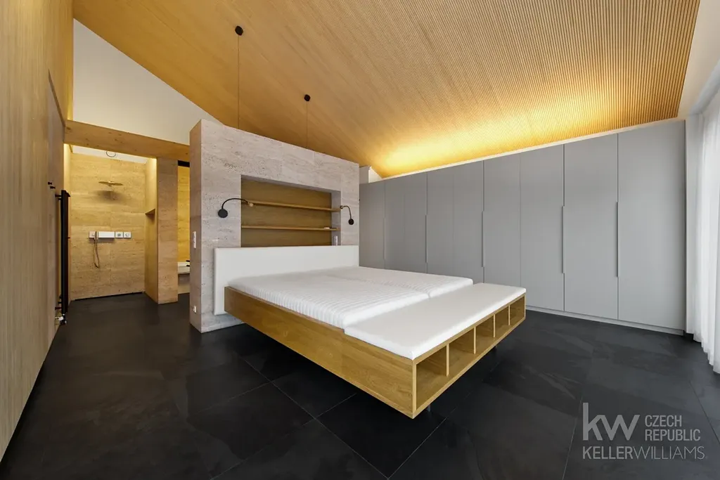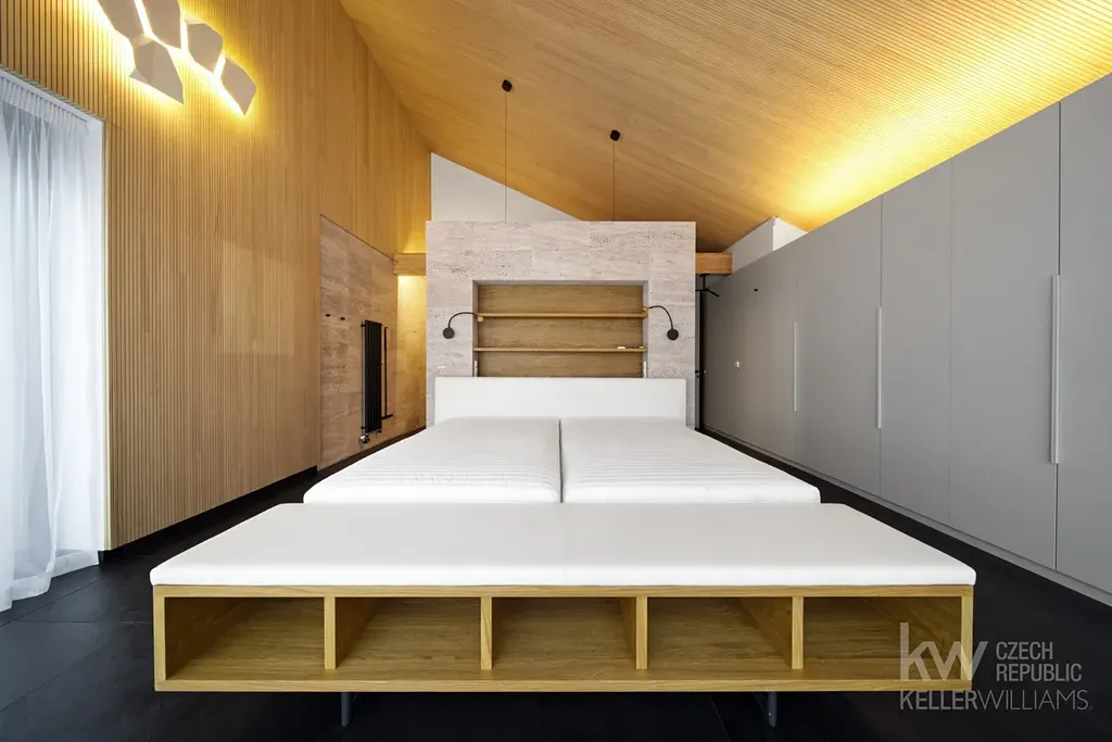 Ložnice nabízejí maximální komfort a soukromí, hlavní ložnice má přímý vstup na balkon. V koupelnách jsou použity designové baterie Gessi, vana ovládaná přes aplikaci a luxusní obklady.