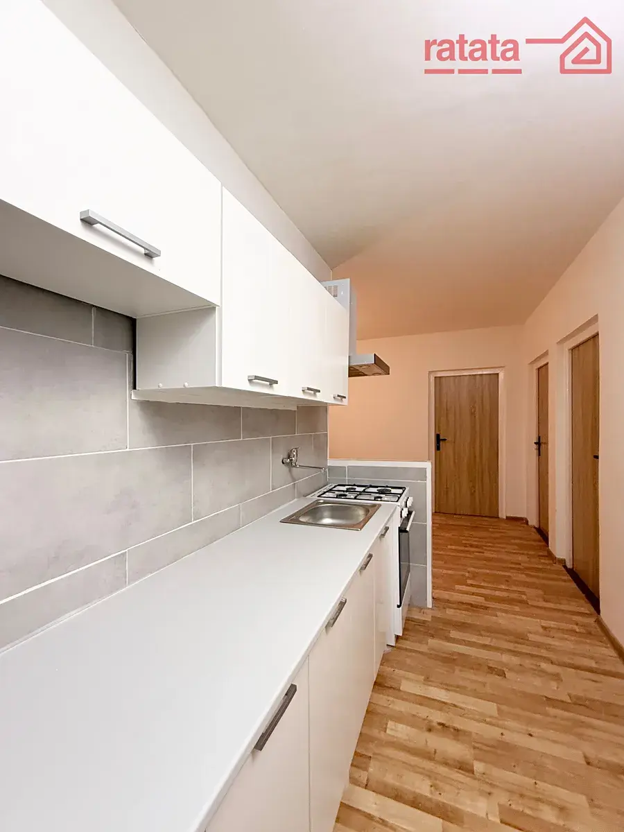 Je to čistý a slunný byt. Je zde kuchyňská linka, plynový sporák, vana, umyvadlo a WC. Na podlahách je položeno lino. Byt je volný k nastěhování IHNED.