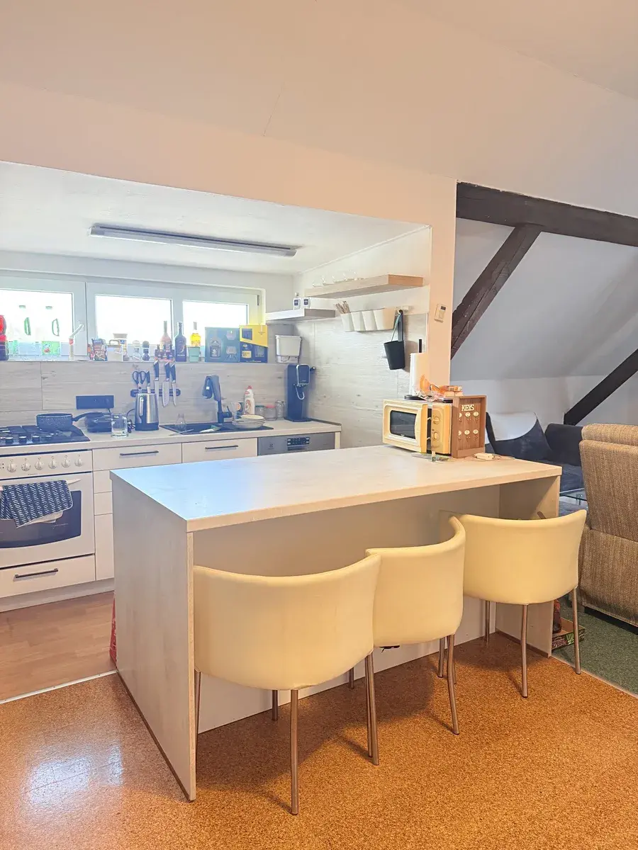 - kuchyň s obývacím pokojem (kuchyňská linka, židle, lednice a gauč)