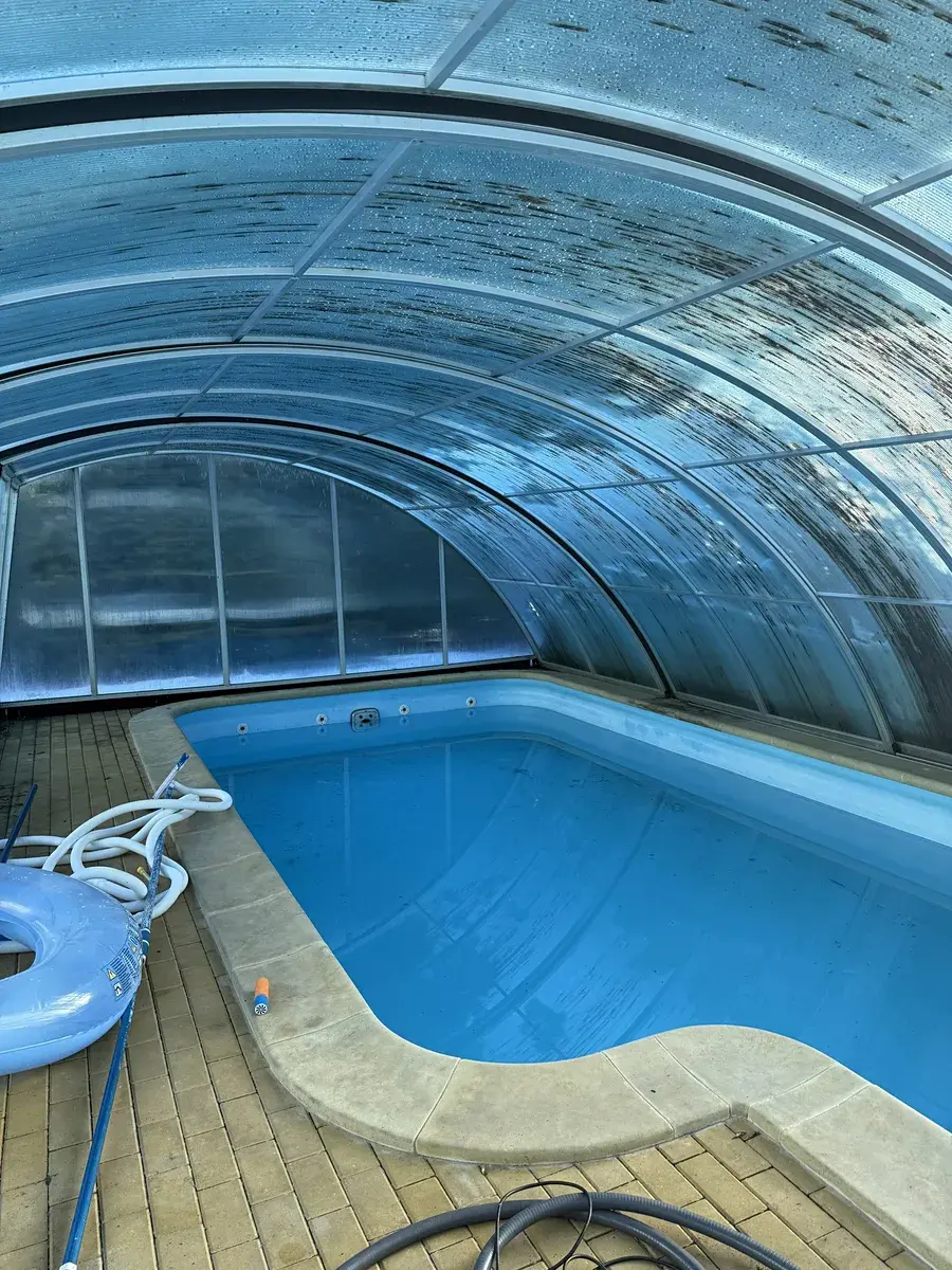 K bytu lze užívat zahradu, kde je posezení a krytý bazén.