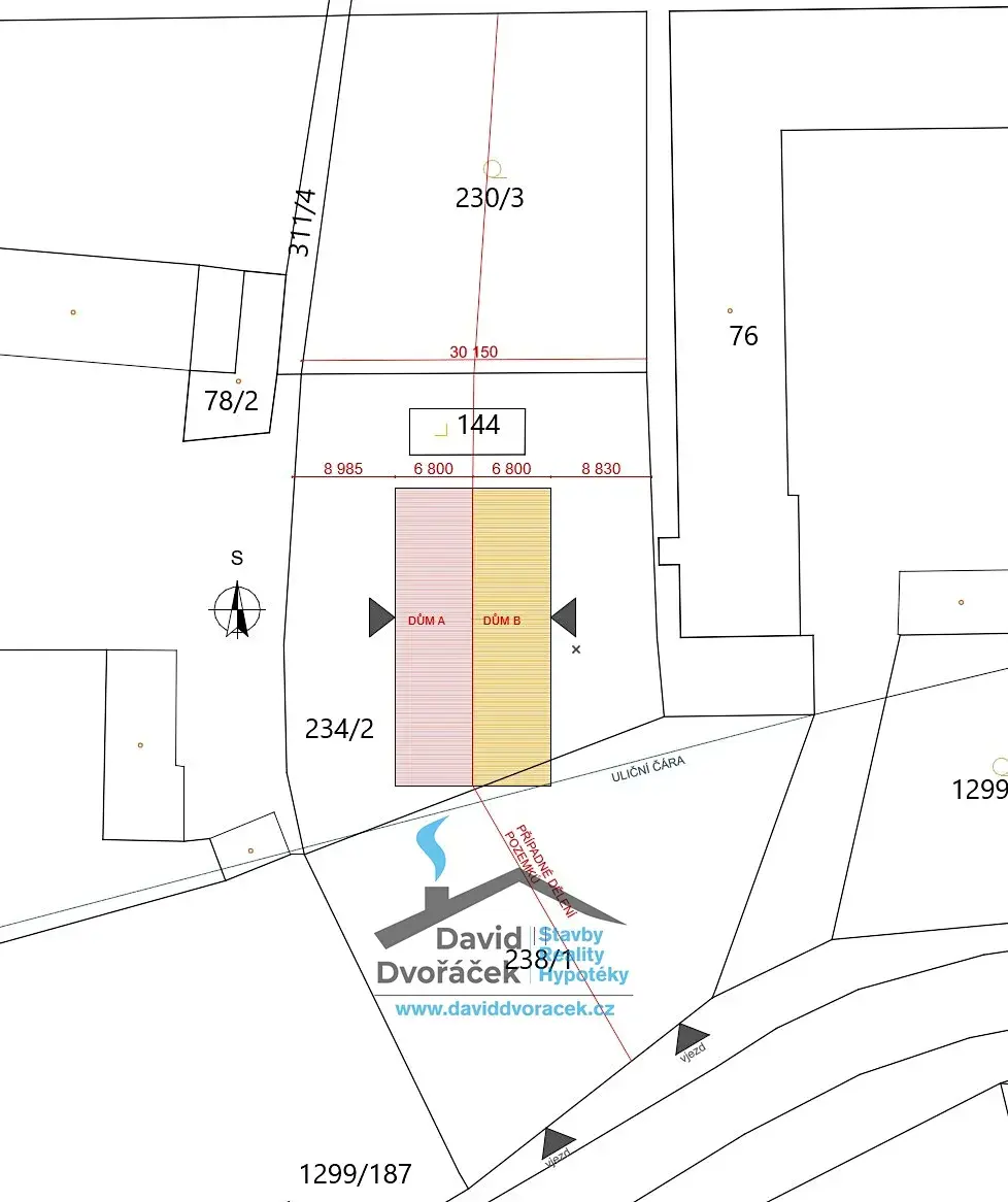 Součástí prezentace je také orientační grafické dělení pozemku a náhled možné zástavby, které slouží jako dobrý základ pro další projektovou přípravu.