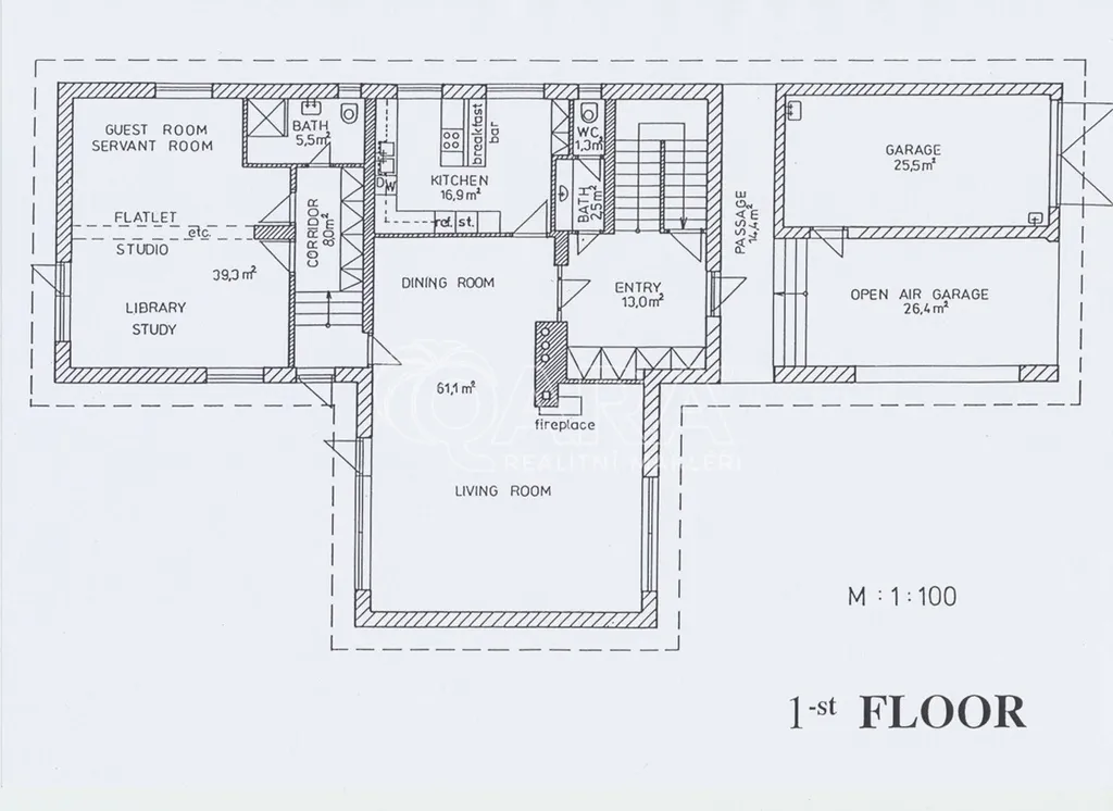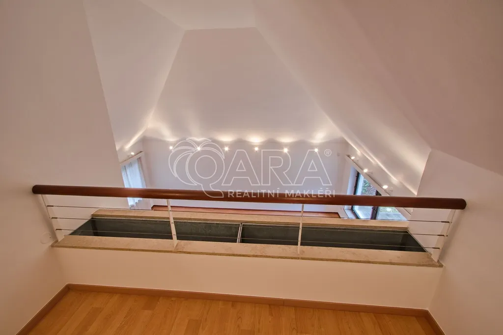 Samotný dům má zastavěnou plochu 264 m2, podlahovou plochu 417 m2, dvě garážová stání a rovinatou zahradu s velikostí 1000 m2. Vnitřní dispozice domu jsou 6+1. Největší je obývací pokoj s krbem a vysokým stropem, je k dispozici i čtveřice koupelen. Firma zde může najít klidné zázemí naprosto odlišné od klasických kancelářských budov. Neváhejte, ozvěte se a rádi zorganizujeme prohlídku.