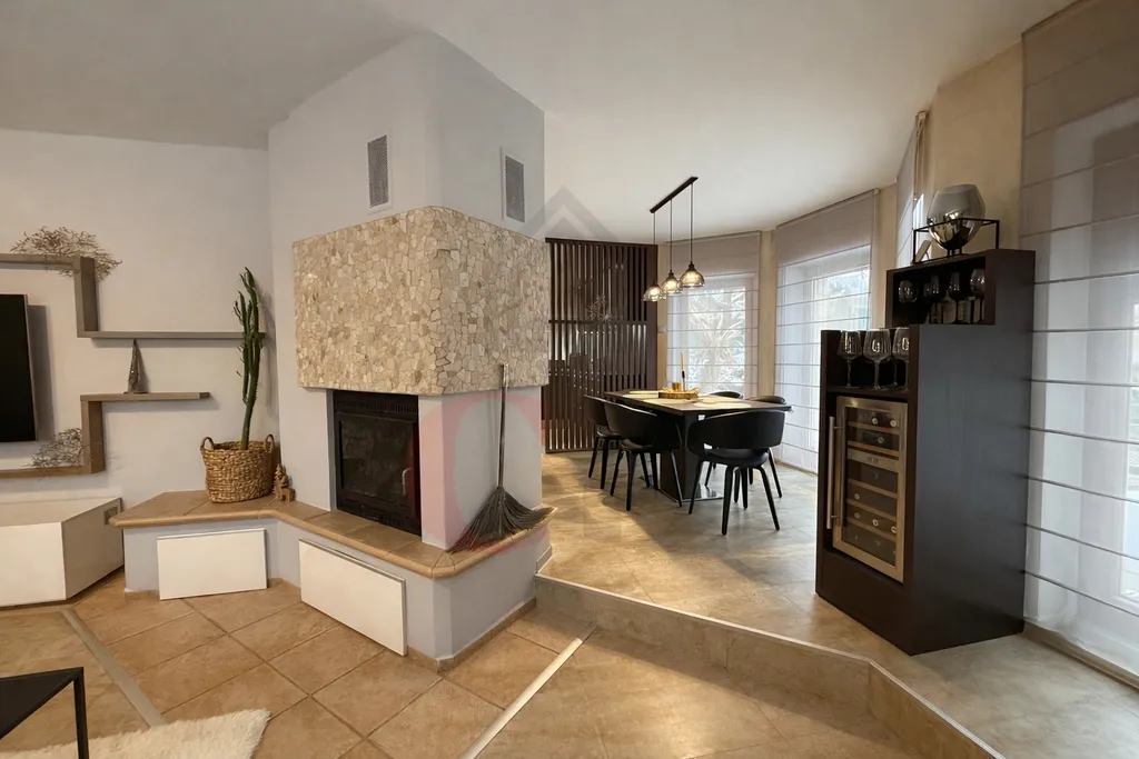 V obývacím pokoji se nachází krb, který tvoří příjemnou atmosféru a nabízí ideální místo pro pohodové večery v teple domova.