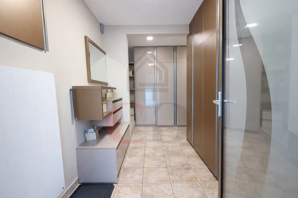 Vstup do domu zajišťuje prostorná chodba s vestavěnými skříněmi. Interiér je nadstandardně zařízený a vybavený. Dominantou domu je prostorný obývací pokoj propojený s jídelnou a kuchyní.