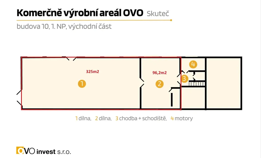 Nabízíme k pronájmu výrobní prostory č.1 a č.2 o celkové velikosti 421m², která se nachází v přízemí budovy č.10 v komerčním areálu na ulici Husova ve Skutči, v blízkosti železničního nádraží. Prostory jsou ihned k dispozici. V objektu je možnost pronájmu i dalších výrobních prostor, stejně jako kancelářských či skladů. Areál je kompletně oplocen a napojen na všechny inženýrské sítě. Parkování je možné přímo u budovy. Nájemné činí 28.000,- Kč + DPH, zálohy na energie se hradí zvlášť. Vratná kauce odpovídá výši dvou měsíčních nájmů. Jsme přímí majitelé, neplatíte provizi realitní kanceláři. Pokud hledáte perfektní výrobní prostor v blízkosti centra města s dobrým zázemím, neváhejte a domluvte si prohlídku.