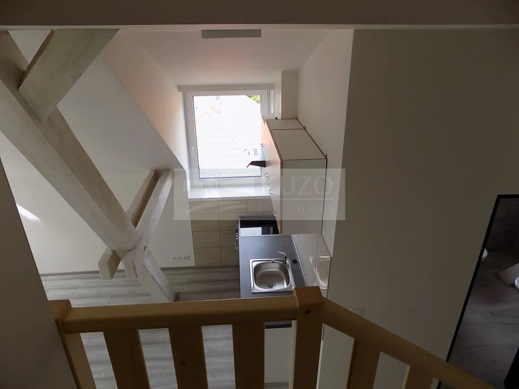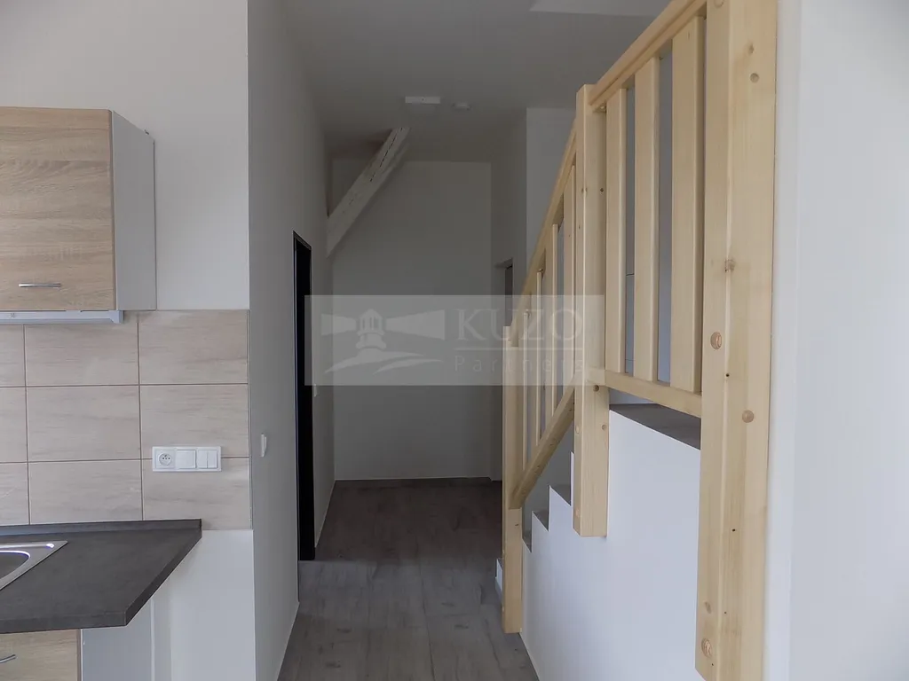 KUZO Partners s.r.o. Vám zprostředkují exkluzivně možný pronájem novostavby atypického mezonetového bytu 2+kk v nově zrekonstruovaném bytovém domě, bývalém Špýcharu, který se nachází v těsné blízkosti centra města Dobříš. Byt v OV o celkové podlahové ploše 58 m2 se nachází ve čtvrtém nadzemním podlaží čtyřpatrového cihlového domu s výtahem a bezbariérovým přístupem. Nestandardní členění bytu je následující: vstupní chodba, odtud vlevo vcházíme do kuchyně s komorou, novou kuchyňskou linkou a sporákem spojené s jídelním koutem a obývacím prostorem, odtud po schodech vystoupáme do atypického podkroví, ložnice, orientované na západ s famózním výhledem na město a okolí. Z chodby vpravo vstoupíme do samostatné koupelny se sprchovým koutem, umyvadlem, koupelnovým radiátorem a WC. Bytový dům, který disponuje deseti bytovými jednotkami, prošel nadstandardní kompletní rekonstrukcí a rozhodně uspokojí náročné klienty s požadavky vysokého standardu bydlení. Parkování je možné v těsné blízkosti domu v neplacené zóně. V blízkosti domu je veškerá občanská vybavenost. Nájemné včetně poplatků činí měsíčně 19500,- Kč ( 16000,- Kč nájemné a 3500,- Kč záloha služby/ 2 osoby). Vratná kauce činí 39000,- Kč. Energie bude převedena na nájemce. Ostatní informace v RK.
