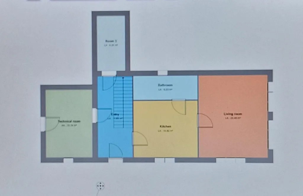 Z prostorného zádveří se vpravo vstupuje do obytné části v 1. NP, konkrétně do kuchyně o výměře 14 m2, která je vybavena malou kuchyňskou linkou. Z kuchyně vlevo lze vstoupit do společné koupelny s vanou a WC. V této místnosti je také technický koutek s bojlerem zajištujícím rozvody teplé vody i do kuchyně a expanzní nádoba pro regulaci centrálního vytápění. Tato místnost má podlahovou plochu o výměře 6 m2. Z kuchyně se také vchází do obytné místnosti o výměře 22,4 m2. V této místnosti jsou krbová kamna, kterými je přes výměník a rozvody do deskových radiátorů zajišťováno vytápění všech obytných místností.