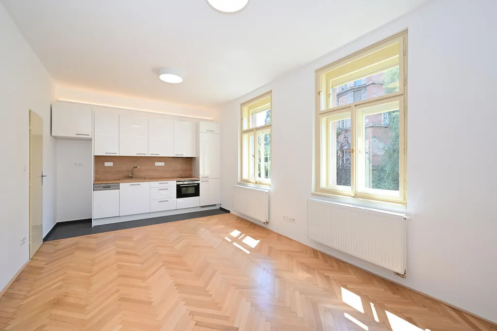 Bydlení s nádechem romantiky první republiky v historickém kontextu lokality. Velmi zdařilá rekonstrukce činžovního domu, v každém bytě citlivá kombinace renovovaných původních prvků s moderním vybavením kuchyně a koupelny. Plně vybavená kuchyně, nový kondenzační plynový kotel se zásobníkem TUV. Možné dovybavit vestavěnou skříní a pračkou. Krásná dřevěná podlaha, kvalitní kuchyňská linka se spotřebiči AEG, lednice, mrazák, indukční dvojvařič, kombi trouba s možností pečení a mikrovlnky, pračka. Okna vybavena elektrickými roletami. K dispozici hezký čistý sklep.