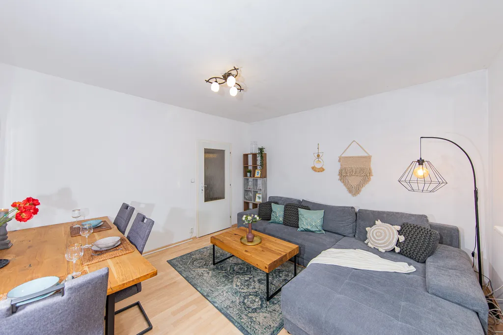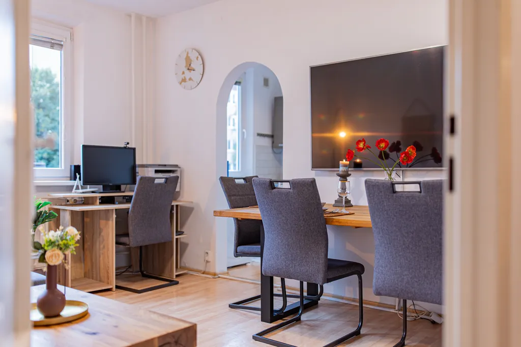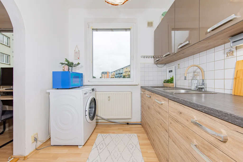 Kuchyně je vybavená kuchyňskou linkou s plynovým sporákem a elektrickou troubou, digestoří, lednicí, pračkou a mikrovlnnou troubou, což zajišťuje plný komfort při vaření. V prostorném obývacím pokoji nechybí velká rohová sedačka a moderní konferenční stolek, který je dokonale sladěný se stylovým jídelním stolem. Nad kterým se nachází televize. Pod okny najdete také praktický psací stůl na PC.
