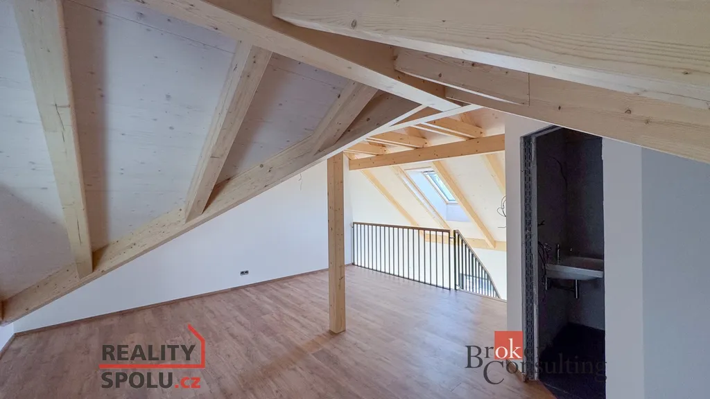 V druhém podlaží je chodba, dvě ložnice, šatna, koupelna s technickou místností a vstup do mezonetových prostor v podkroví, které nabízejí originální kombinaci pracovny a ložnice.