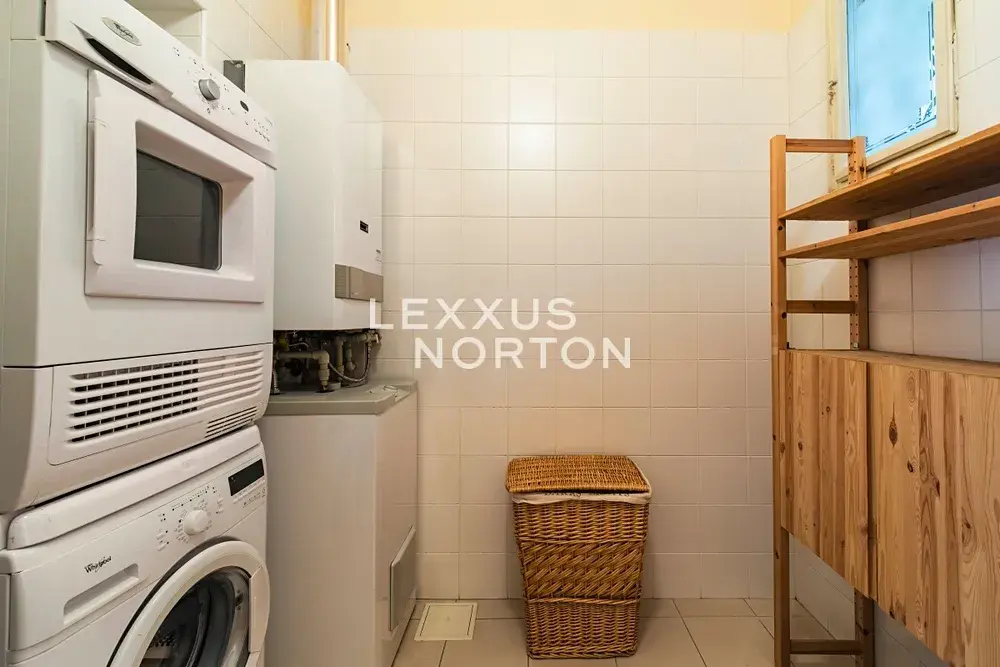 K dispozici je plně vybavená kuchyňská linka (sporák, trouba, lednice, mrazák, mikrovlnná trouba a myčka nádobí), obývací pokoj s jídelním stolem a sedací soupravou, ložnice s postelí a vestavěnými skříněmi, koupelna s vanou, toaletou a umyvadlem) a druhá koupelna (se sprchou, umyvadlem a toaletou), prádelna s pračkou a sušičkou.
